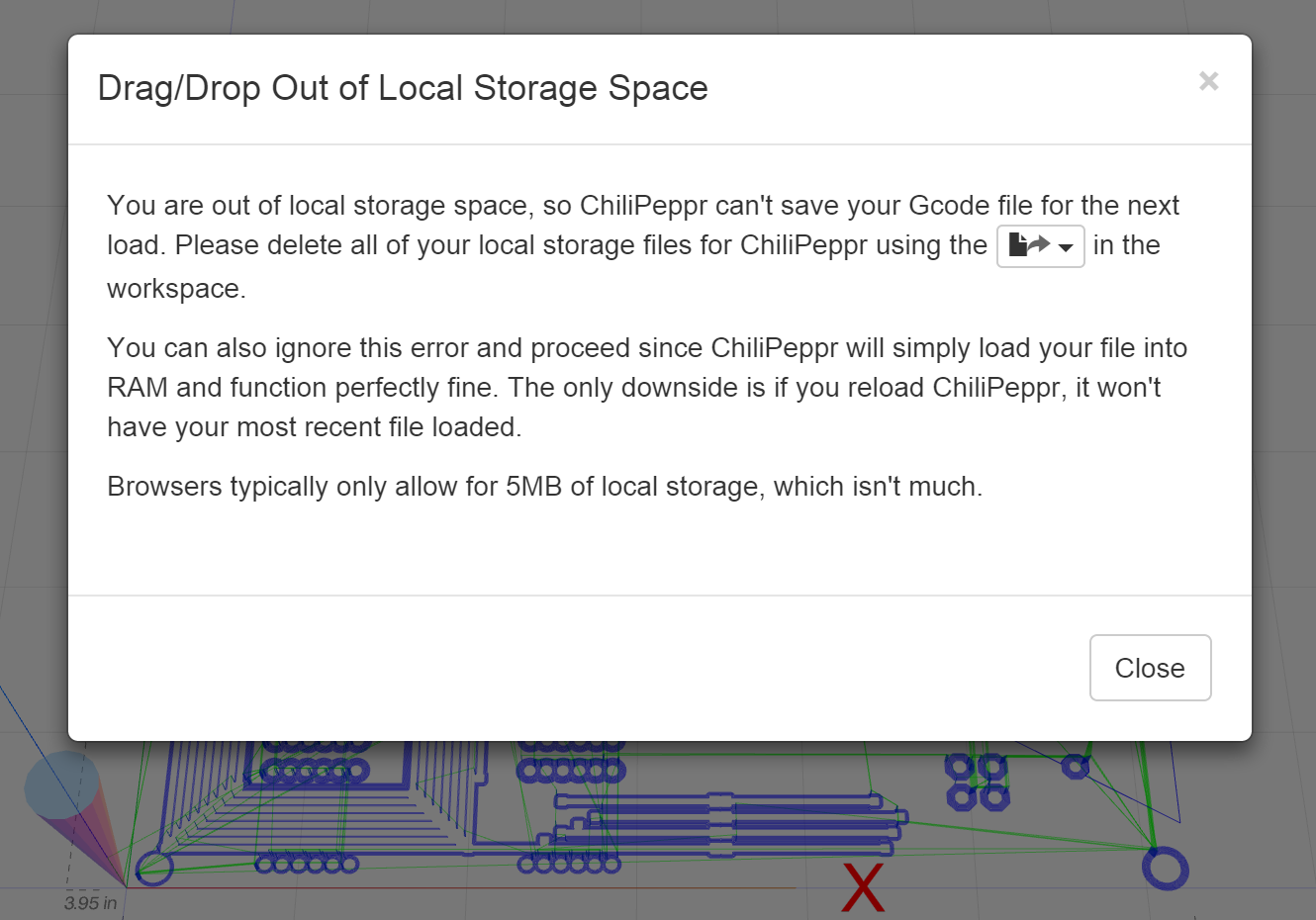 ChiliPeppr now handles browser out of quota local storage errors correctly. This caused some problems with some users in the past and no longer should. Even if you run out of disk quota, you can still keep running without issue.