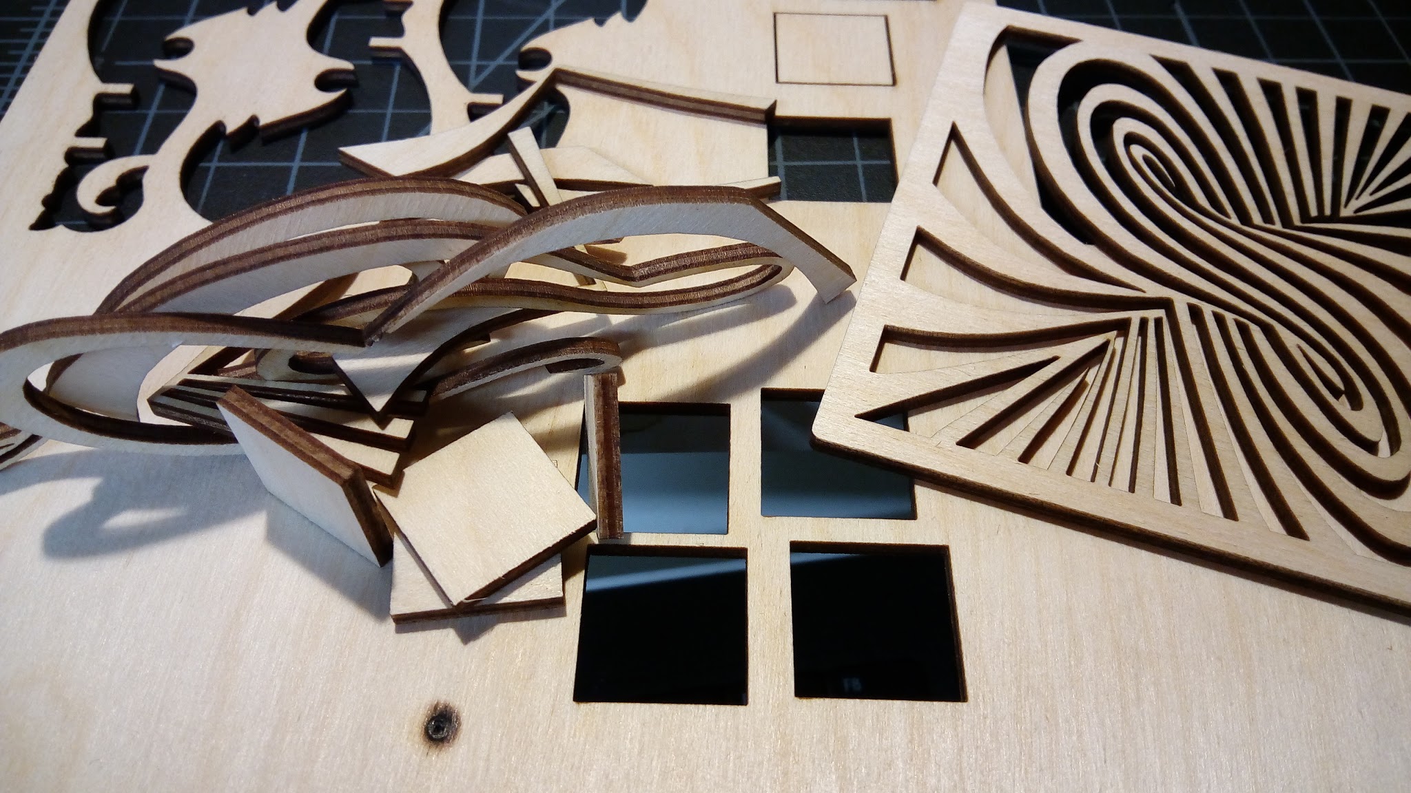 Chiller time!! Got my chiller built up and running. WOW. Running tube temp at 15C allowed me to cut 1/8" birch at 18mm/s@8mA tube current. Yes, the tube current is accurate. I am not using the stock meter. Here are some pics. The squares and twirl were cut at 8mA and 18mm. Very nice cut quality. the square still in the sheet in the background was at 22mm/s. It DID cut mostly through, but didnt fall out, so it doesnt qualify, even though it would push out without tearing out the wood. The chiller was built out of an old de-humidifier. I am running the tube closed loop with a radiator in the chiller water, with a pump to flow cool water over the radiator. This allowed me to keep the dehumidifier mostly stock looking, and fairly neat, plus a closed coolant loop on the tube will keep me from having to change the coolant very often. If anyone is interested I will post the parts I used, and how I done it. Very inexpensive to do if you can find a dehumidifier cheap. About $70 in parts + a junk dehumidifier.