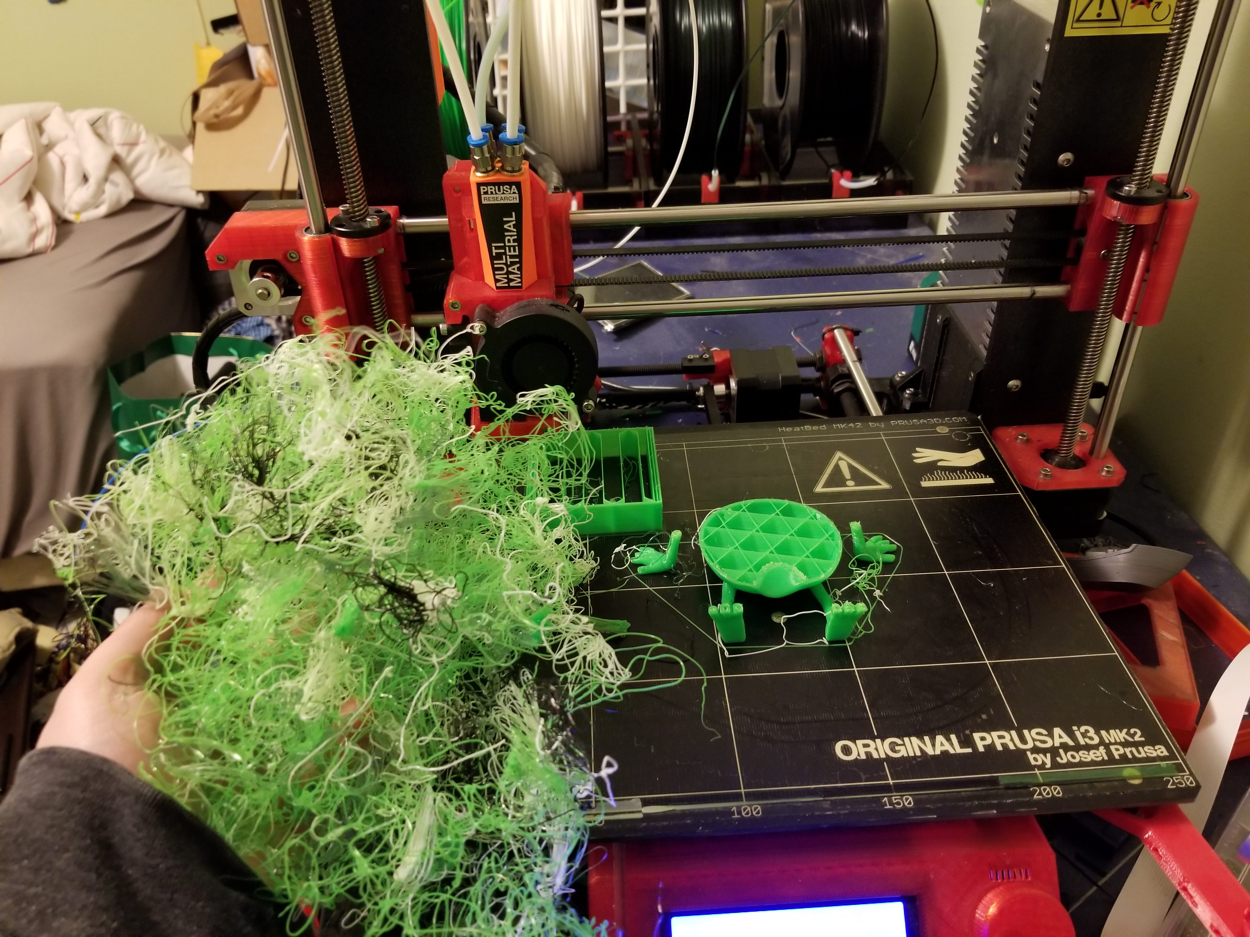 @Duncan_Gunn I wasnāt home to watch it, but what I believe happened is a blob formed on the end of the filament which prevented it from being inserted. Then when it cycled back to the light green filament there was enough momentum from it moving after retracting above the Y splitter to force it through. Itās happened a few times, sometimes it skips steps then works fine. I think a big part is the friction and moment forces on the filament due to the multi material upgrade. Iāve been meaning to add a feed tube all the way from the spool holder to the extruder to help keep the feed more consistent and ensure more even flow. Iāll probably just replace all the bowden tubing with Capricorn tubing.