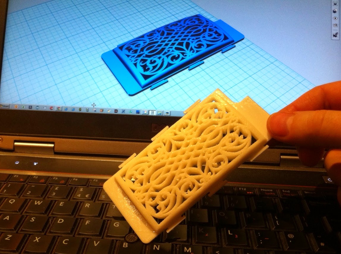 Continuing my experimentation with 123D Design, I’ve found importing vector graphics very useful. It’s a quick way to incorporate complex patters into a design. While working on a phone cover insert design, I found that a “scroll saw pattern” from here http://www.craftsmanspace.com/free-patterns could be quickly transformed giving it an unusual and pleasing look. Subtracting the extruded pattern from a large sphere gave it a nicely domed contour, making it a bit more than just a cookie-cut pattern.