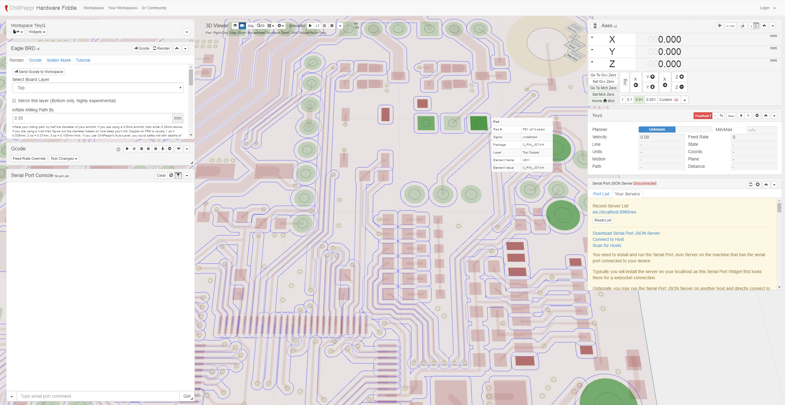 CP seems to be drawing a tool path that does not produce the result indicated by my board drawing. Using EagleCad, my board includes a pin pad, and both the board and schematic views seem to show that each of the pins are isolated, as they should be. However, the CP render (and, no surprise, the board it actually produces) do not isolate some of the pins. I will post screen shots momentarily.