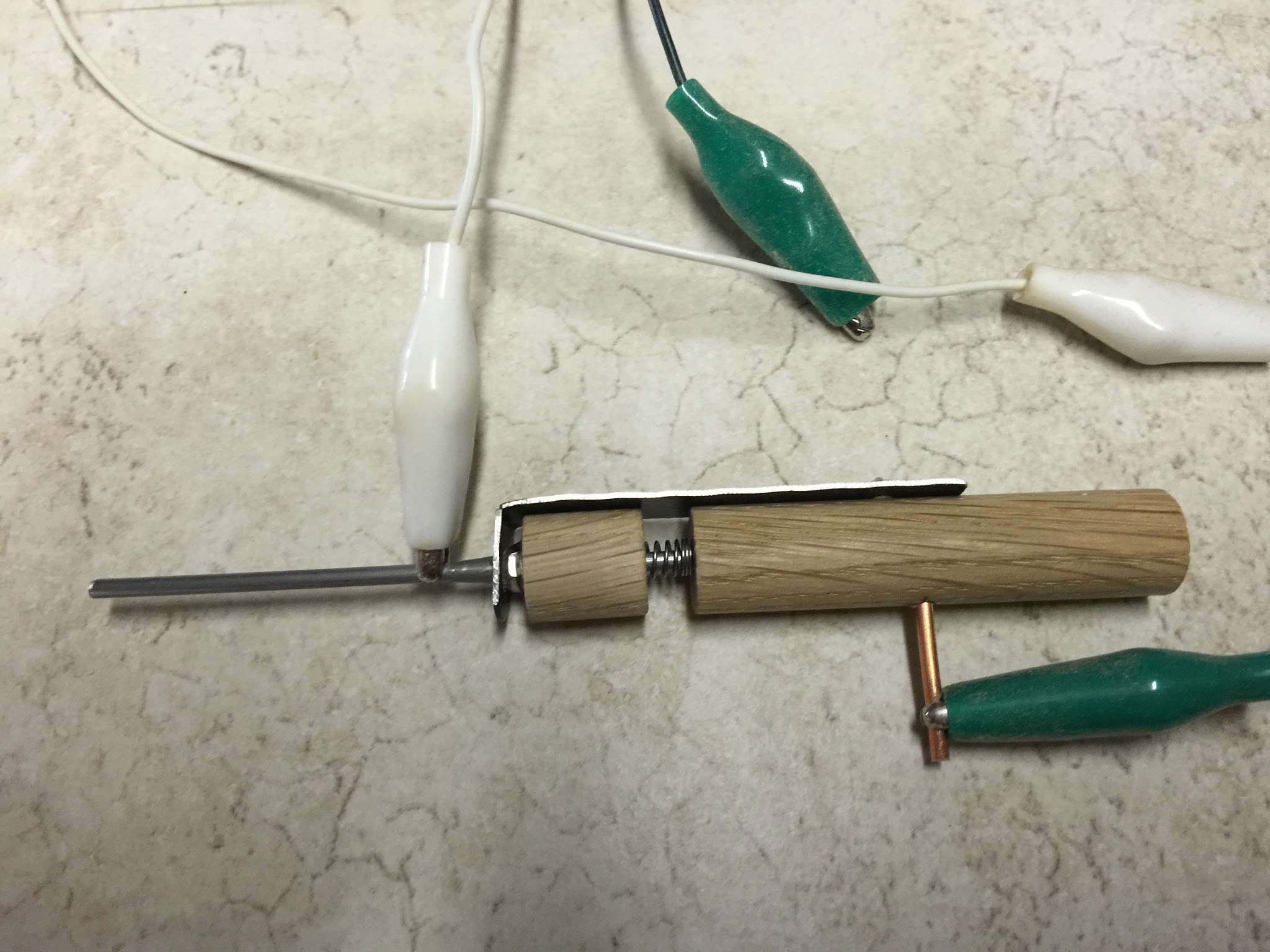 Crude touch probe to use on non metal surfaces (i.e. Wood). The copper pin goes into the base far enough to make contact with the steel pin. Believe it or not but it’s fairly accurate - at least for wood surfaces. I used a .5" dowel rod for the main housing. I’m sure there are much better ways of doing this.