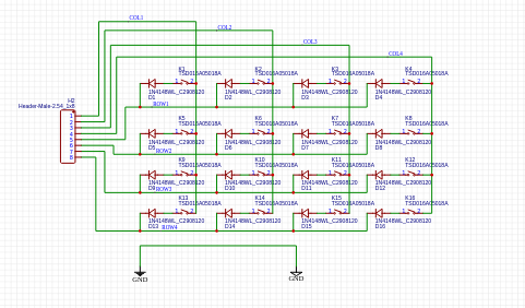 As we can see above, the schematic is very basic. 16 switches, 16 diodes and a single 8-way header pin. Pin 1 to 4 on the header is connected to Columns 1 to 4, and Pin 5 to 8 is connected to Rows 1 to 4.