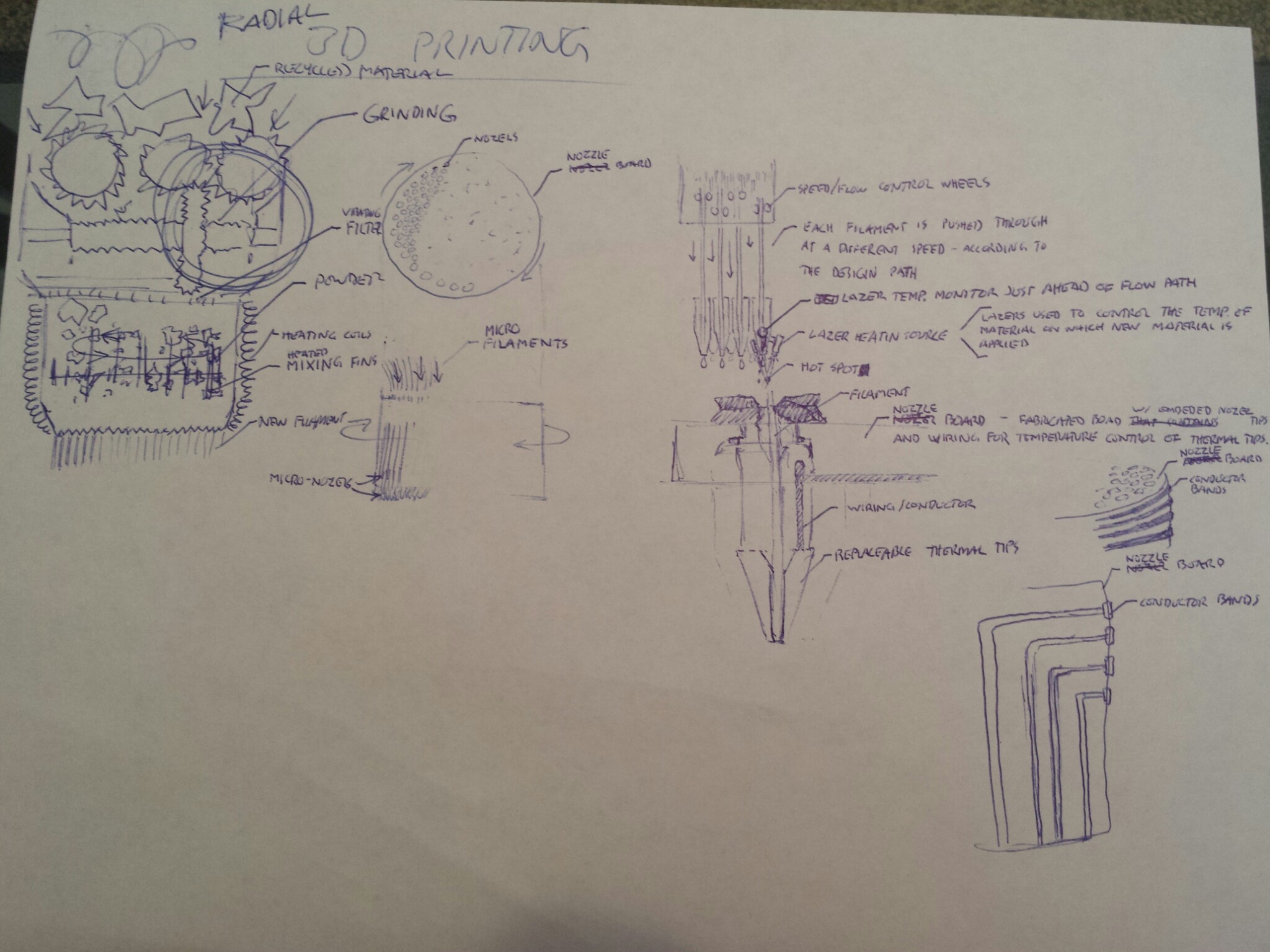 I created this crude sketch of my ideas for the Multi-Nozzle Radial 3D Printing process, but my lack of experience only produced more questions.