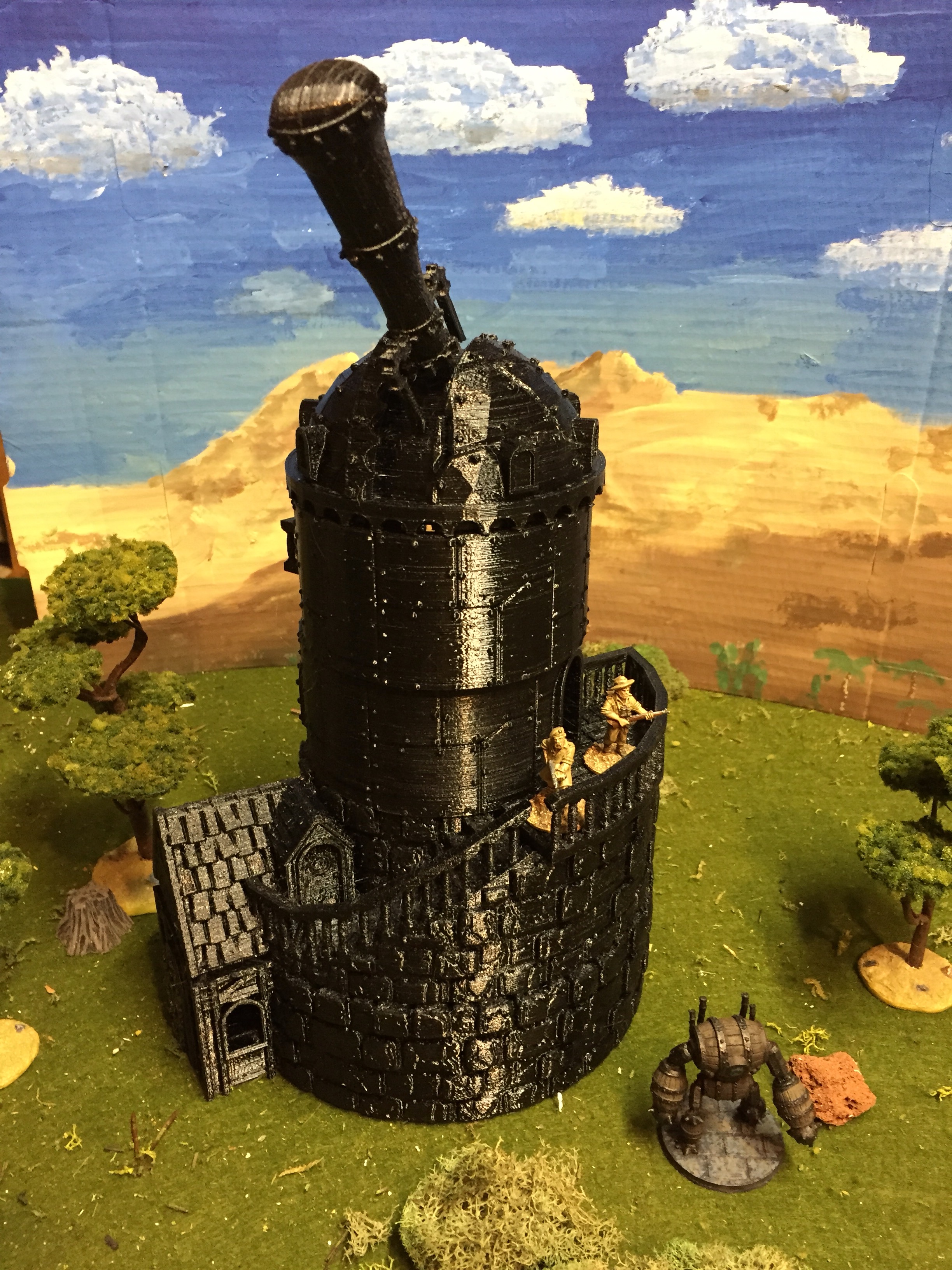 Dry fit of the unpainted Printable Scenery Observatory printed in PETG with a couple 28mm figures on it for scale, and the Barrel Golem by Dutchmogul from Thingiverse just because it suits. Upper floor is cocked in a bit to provide a lip for the balcony on the backside to sit on. I’ll glue it on in the final build so it can sit aligned. ~560 grams.