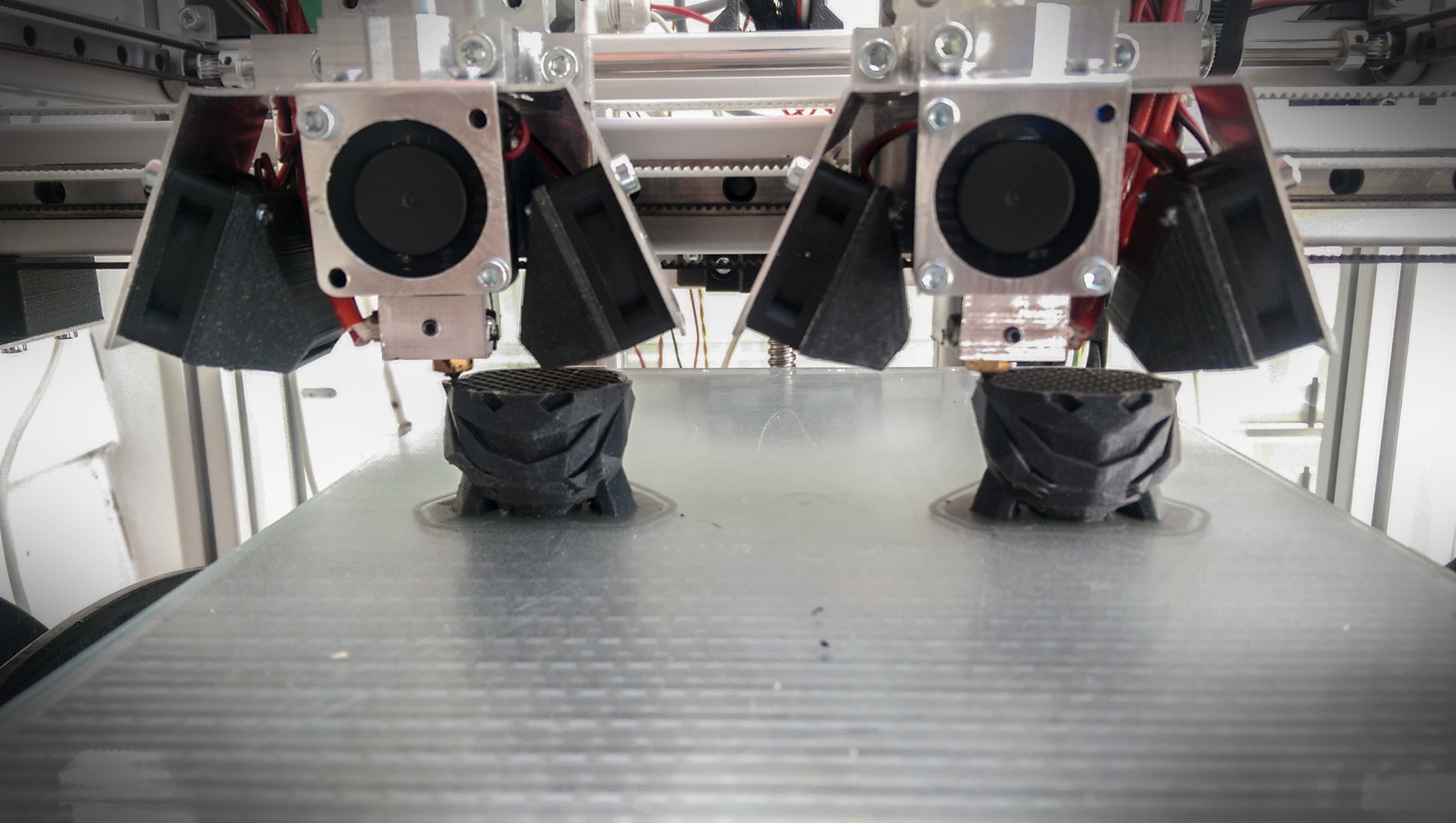 Dual X Carriage duplication printing. For faster production in less time with better quality by printing slower and finishing faster than with a single extruder with double the speed.