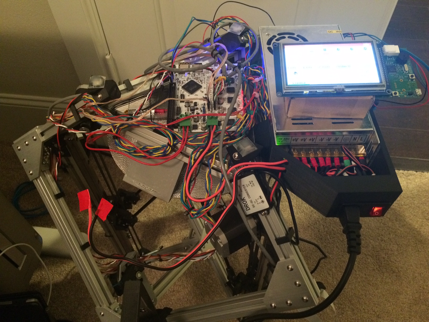 ARM M4F processor (faster than the M3s in Due and Smoothie v1), runs RepRapFirmware (which is very nice), uses super-fancy SPI-controlled TMC2660 drivers, and has an onboard ESP8266 for wifi. Obviously I also had to hook up a PanelDue for sweet touchscreen action.