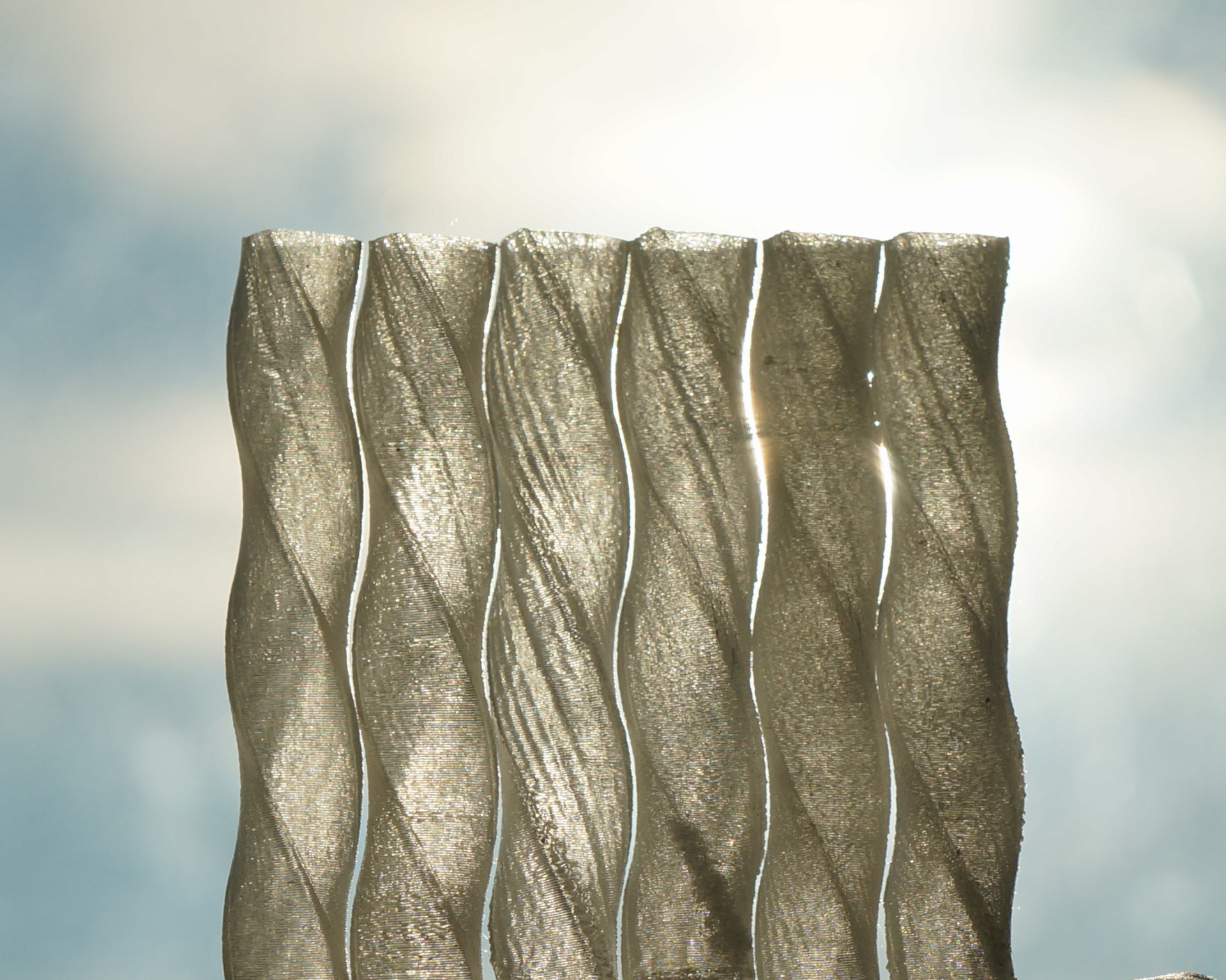 The PETG I am using here dislike beeing hot for a longer time within the nozzle. So the most transparent result (3rd from left) was obtained with 300% Multiplikator, clearly showing that my mechanical system could not bear this and produces “wobbles” due to vibrancy.