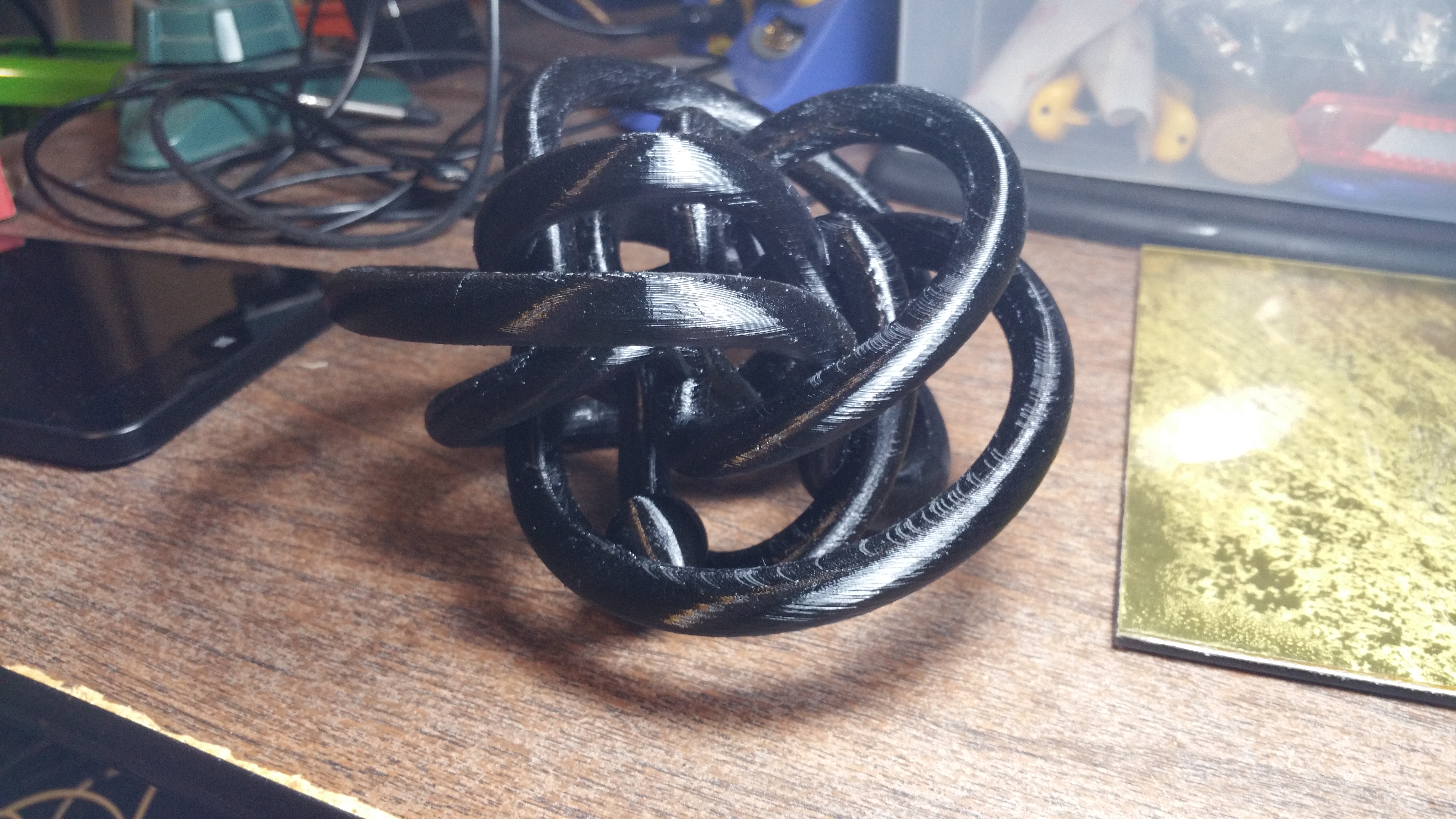 E3d showed off this amazing print at MWRRF this year using their new-ish Scaffold dissolvable support material. http://www.thingiverse.com/thing:512210 (credit to Emmett for the awesome file) I think they mentioned it being “impossible” to print any other way (on fdm printers), and that seemed like a challenge. I tried 4 other times with abs that ultimately failed because of the edges curling up and hitting the hotend. I was finally able to print it on my first try using esun PETG, with the support material from Simplify3d. It took 26hrs 15min to print, another 15min for support removal (mainly because of the raft), and another 15min to remove the stringing (used a wire brush and a heat gun). Other than the stringing, it came out pretty well. I haven’t printed with PETG on this printer very much, so the retraction needs to be tuned a bit, and maybe lower the temp by 5 degrees. The only other thing I would change is to remove the raft and increase the size of the ball. Even though the ball was printed inside, the tolerances are far too much, so it falls out pretty easily.