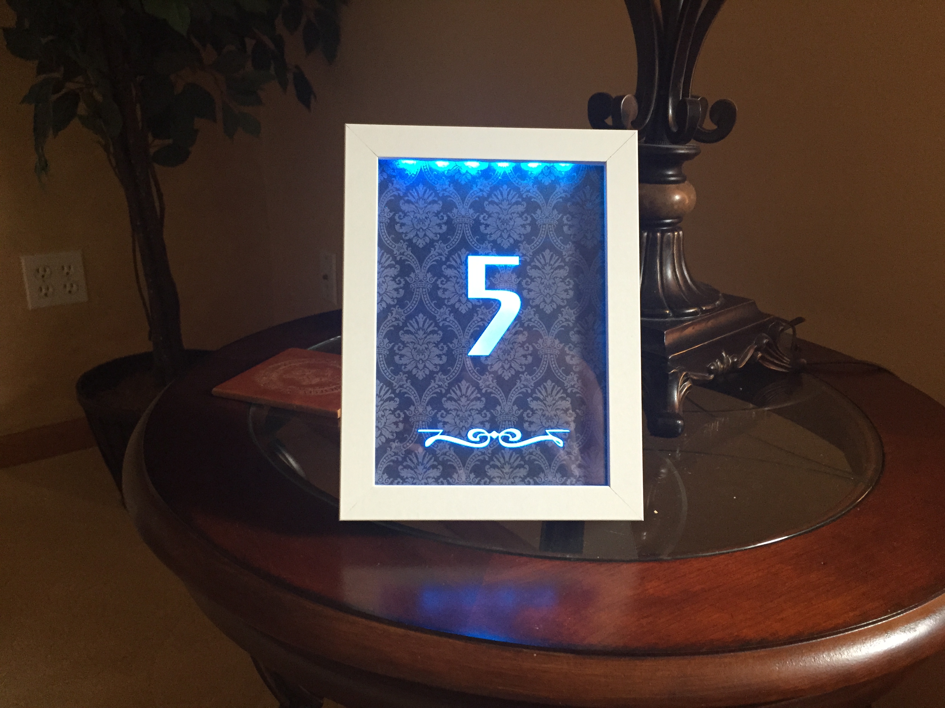 Edge-lit table number frames. Instructables coming soon!