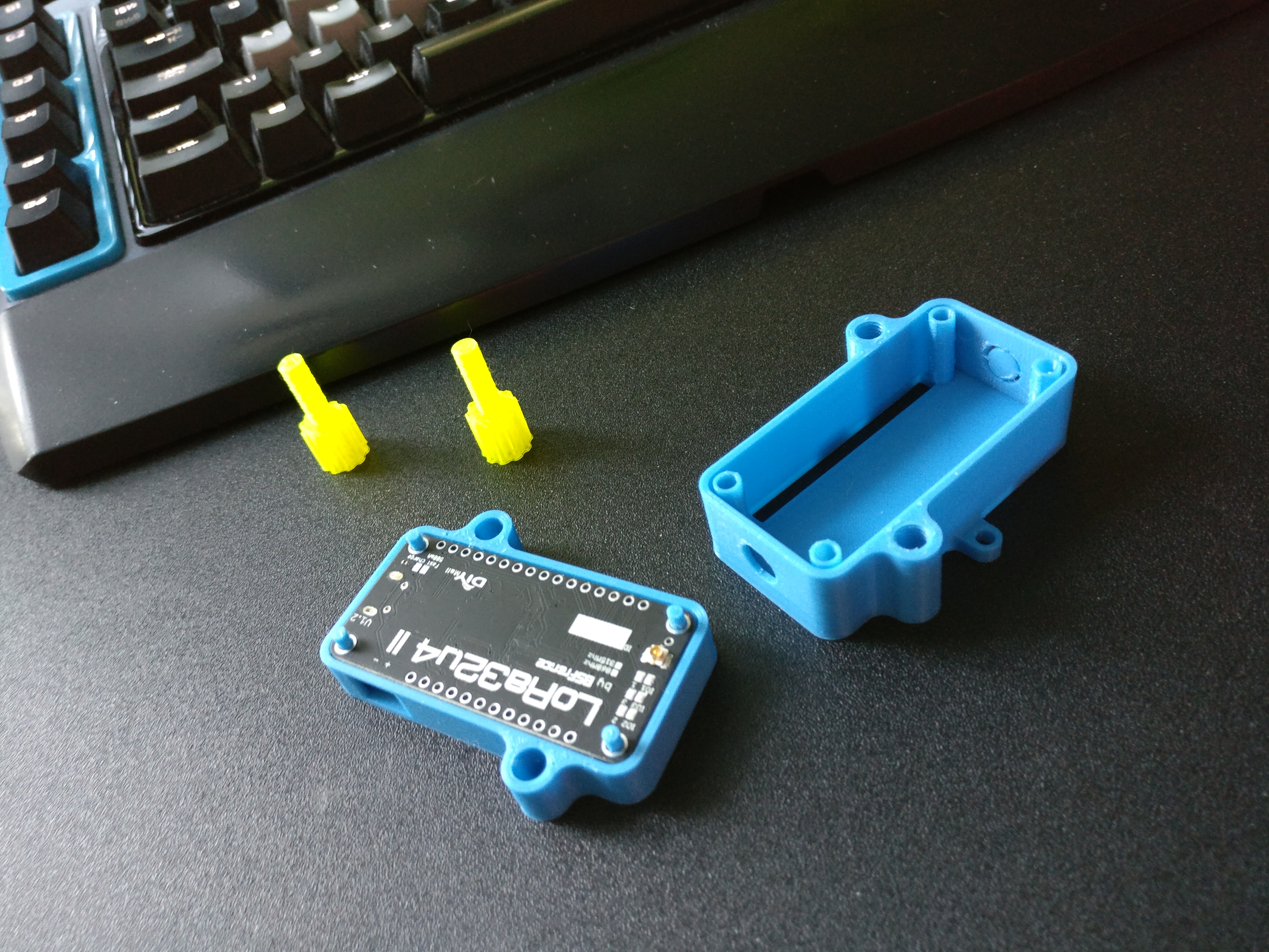 These pictures are of my latest creation, a case for the Lora32u4 II - devboard. It didn’t quite come out as pretty as in the renders, but it works well, nevertheless. Oh, and yes, 3D-printed threads work perfectly and make for very pretty, custom screws and nuts