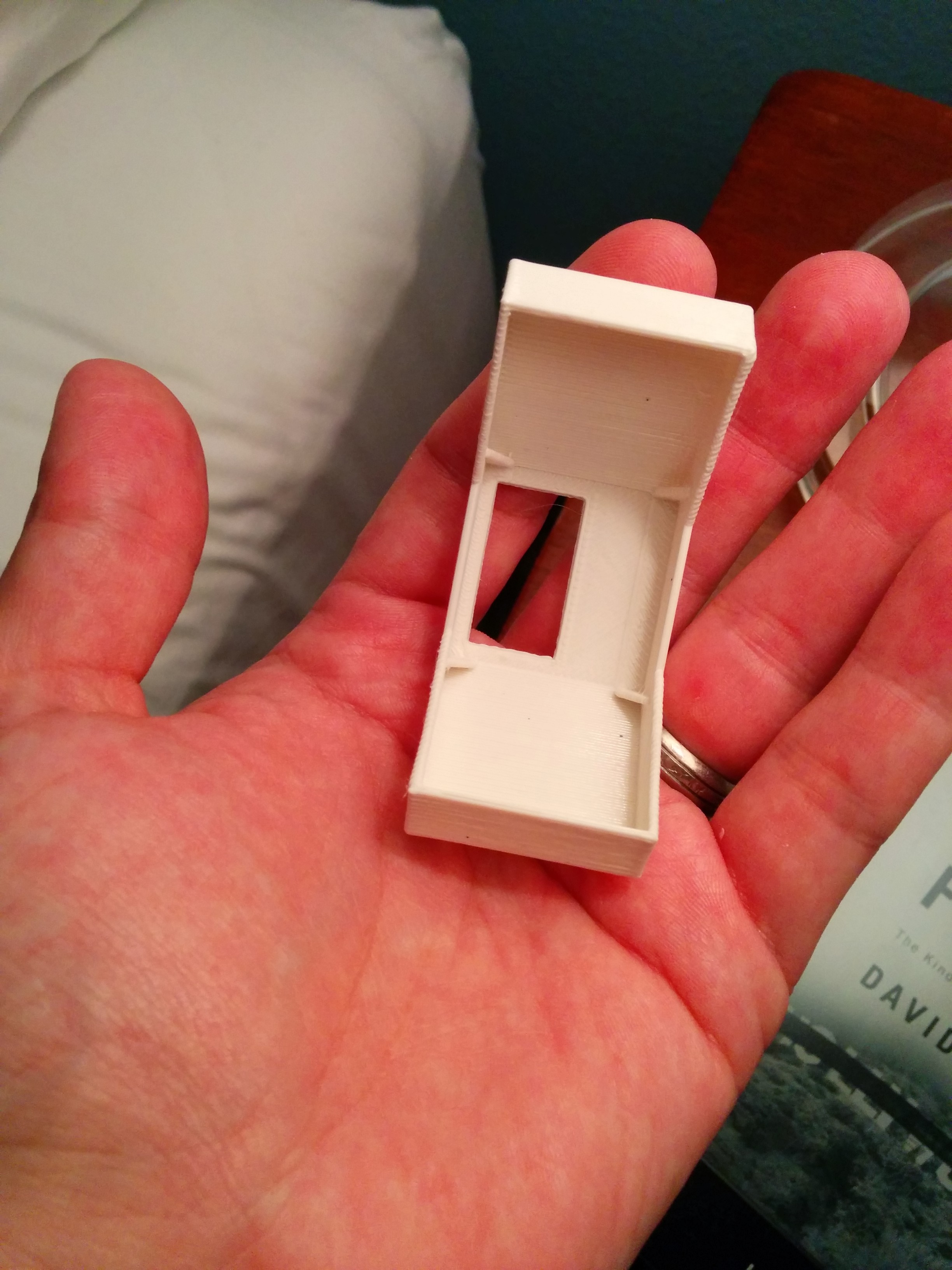 So I took a chance and printed it on its back. Not bad, though at 60° from vertical its still too steep. You can see some print errors. So I changed the model to 45° . Much Much better.