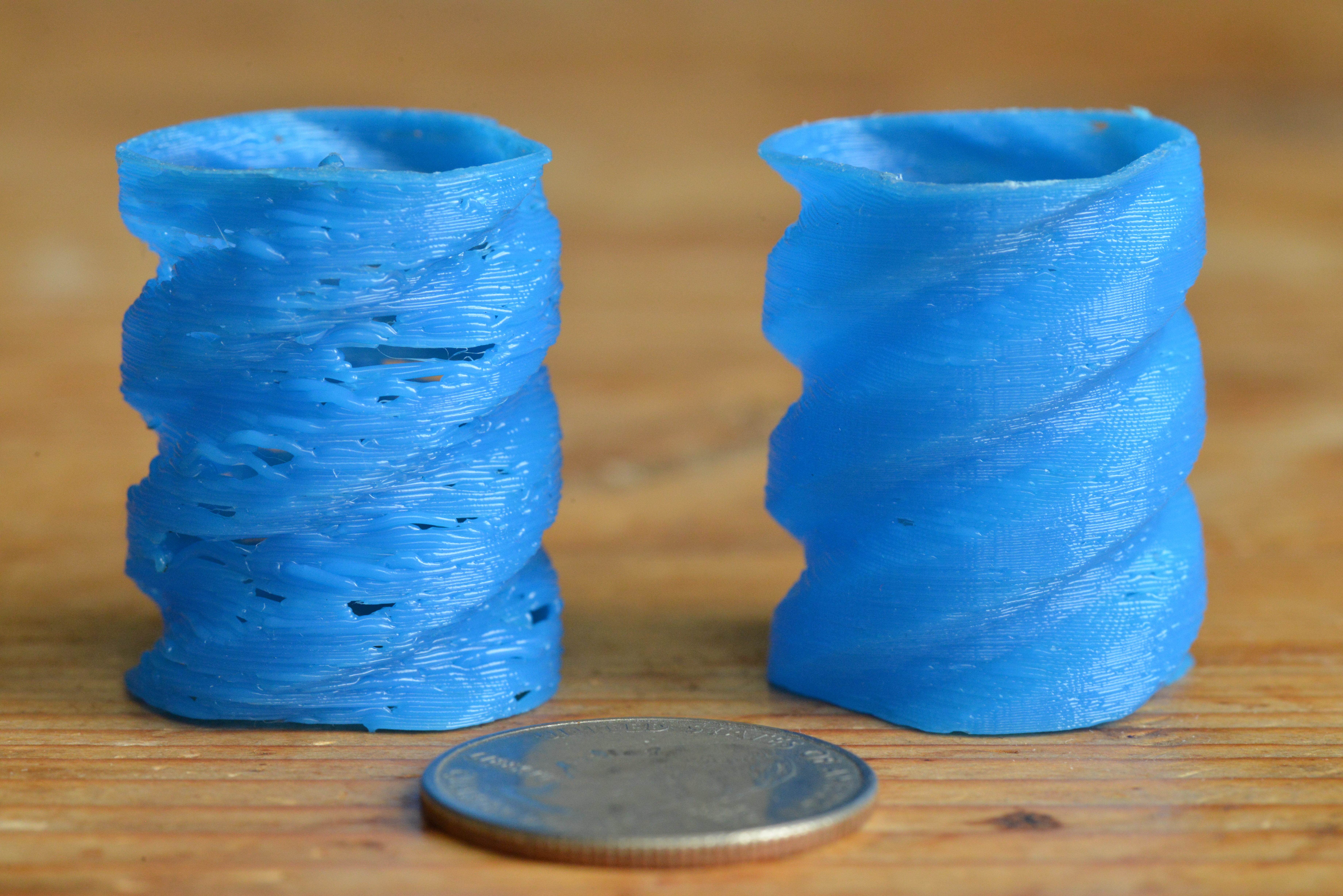 Here, I am trying some Nylon trimmer line as ‘filament’ (extruded at 260 degrees, all metal hotend; size is about 1.67mm, corrected for that). It had been sitting around for a while, so it absorbed quite some water and was creating little steam puffs every second or so. The bad quality printed screw on the left shows the result.