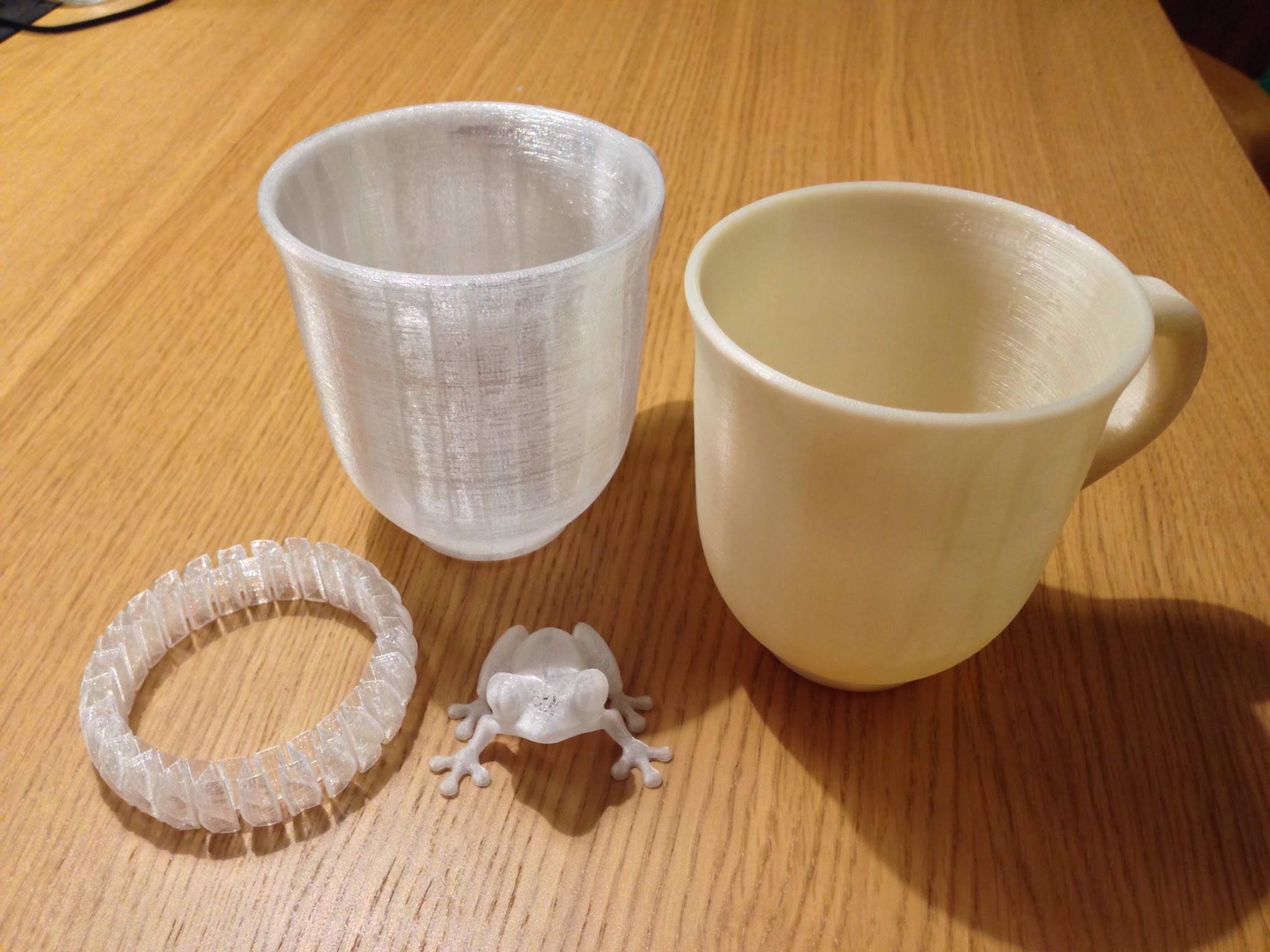 The coffee cups and bracelet is printed at 0.2mm layer height and the frog at 0.09mm.