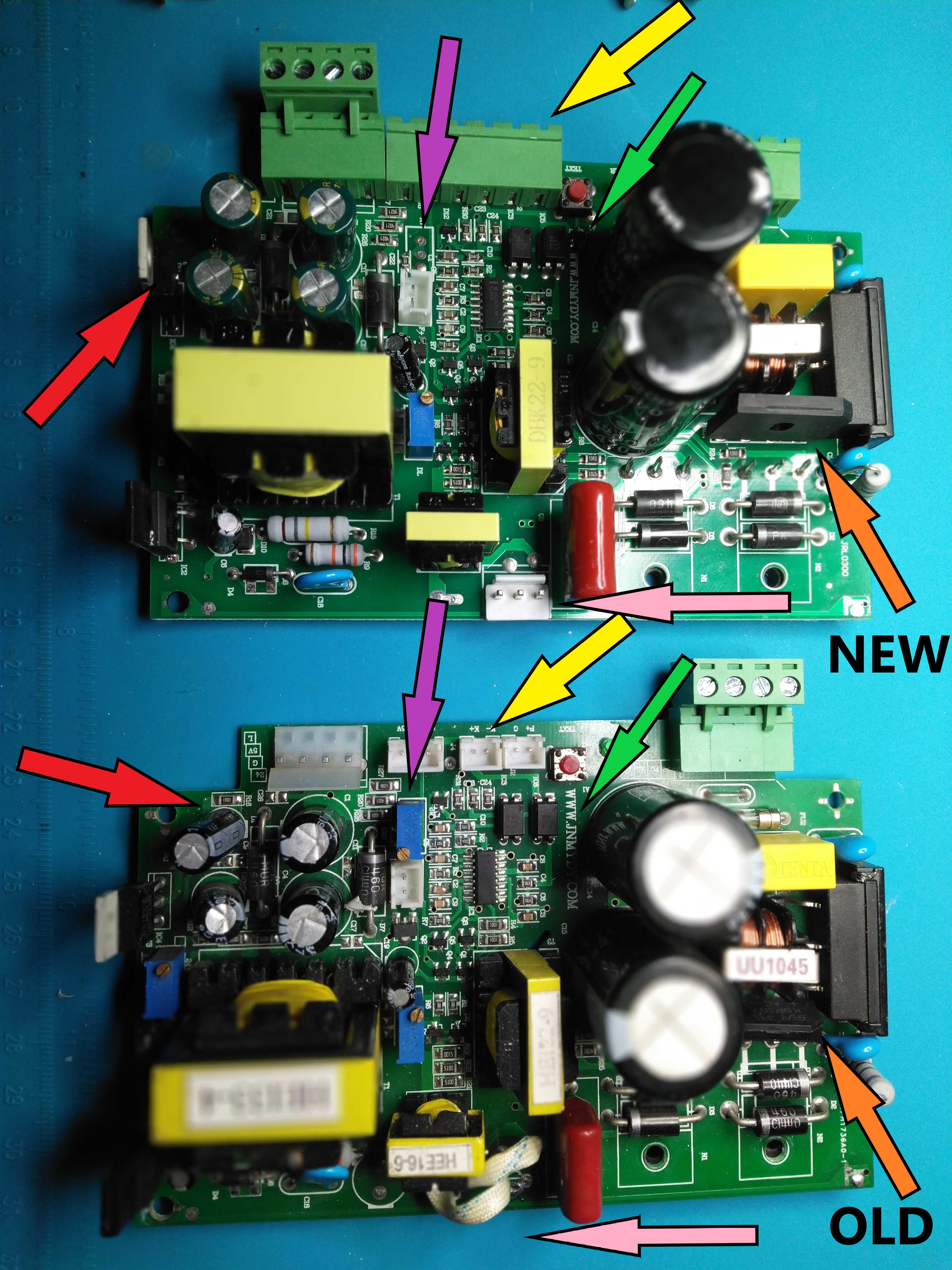 3: Yellow arrow. The front panel connectors were replaced with larger ones. Pin out similar.