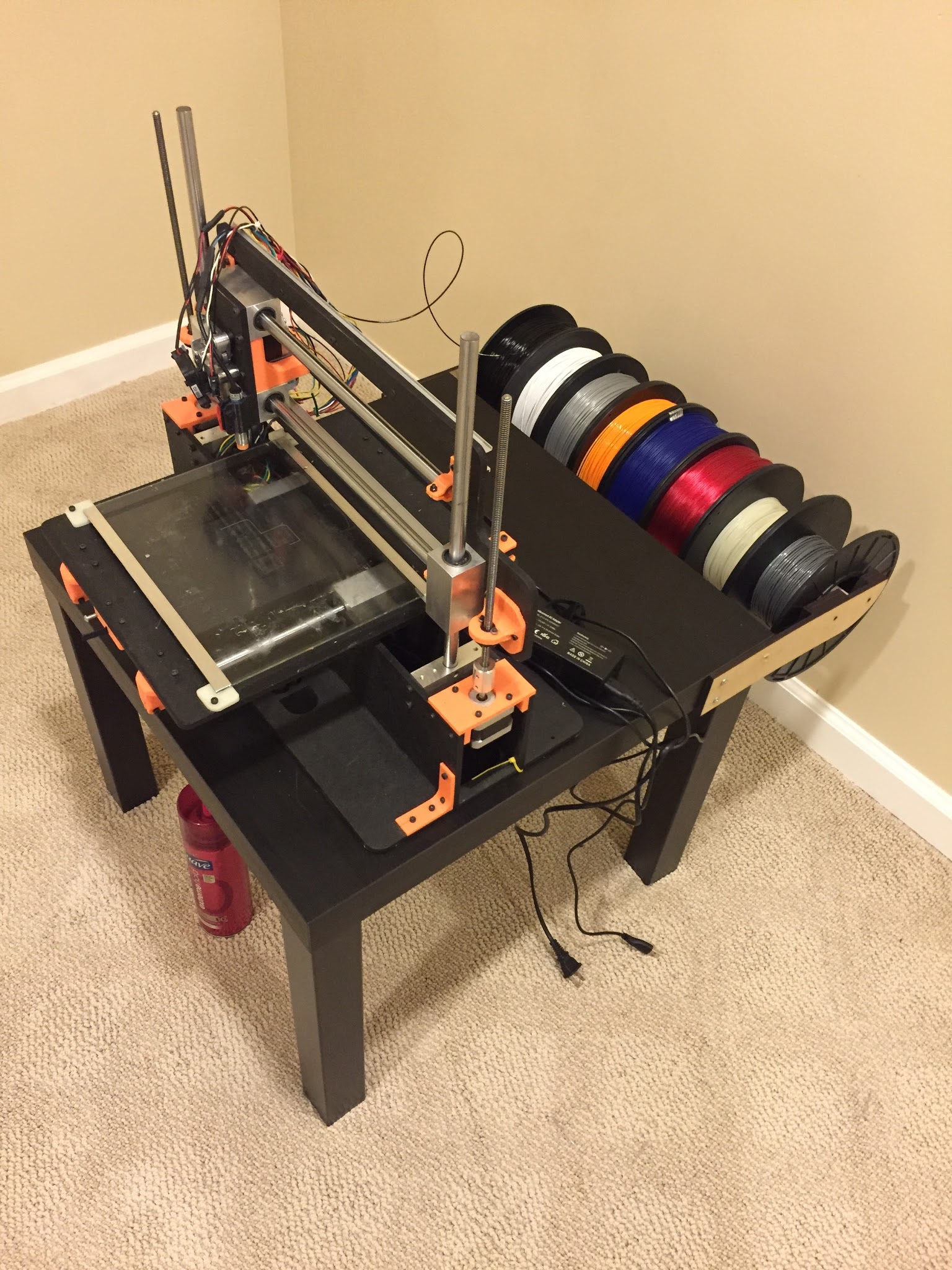 Finally got around to moving my printer. I bought a cheap table from ikea $10 and laser cut a spool holder system for the back with 550mm 1in pvc. Needs to be painted but I love how it looks/works.
