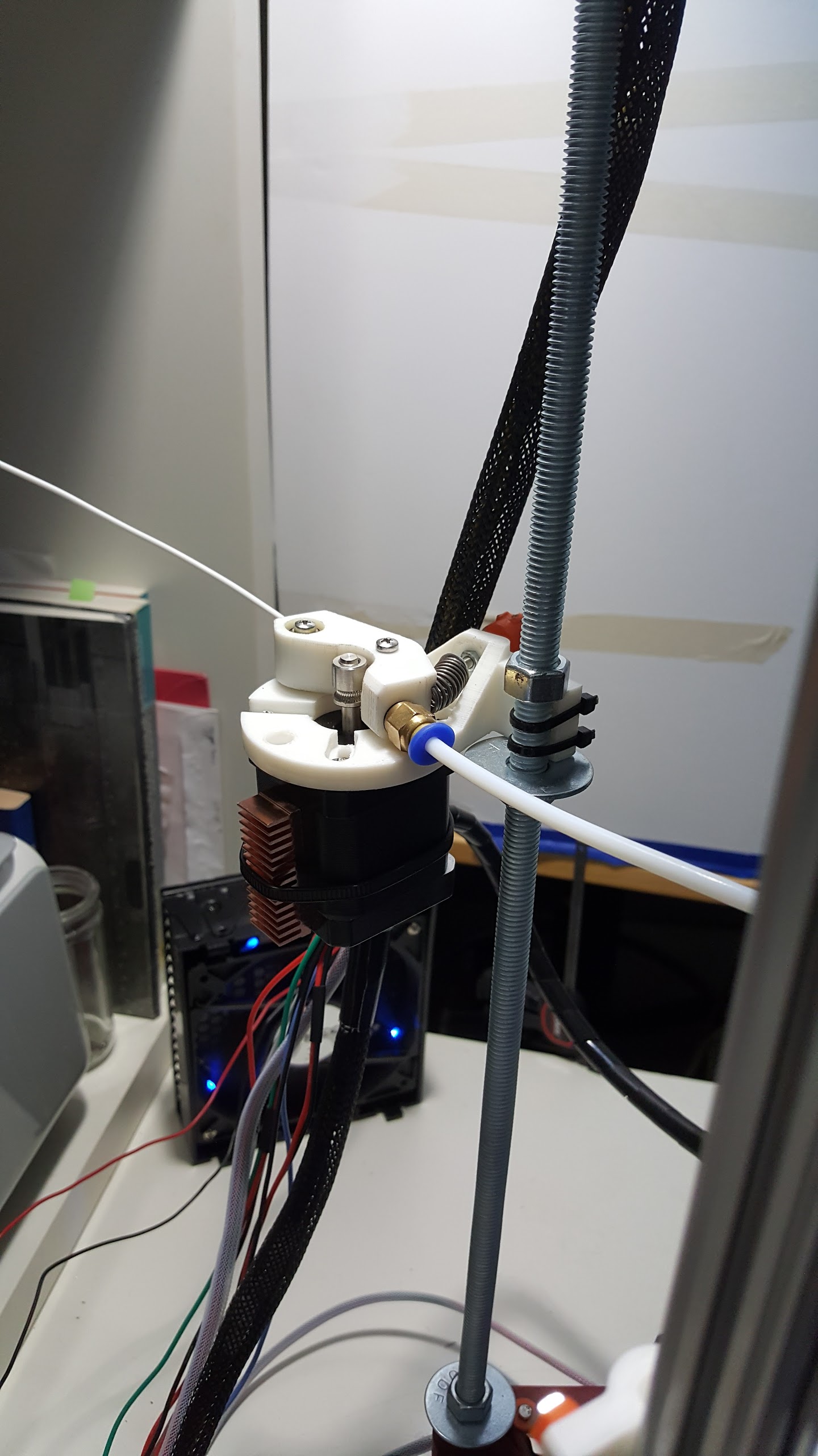I am wondering how easy it would be to implement an extruder Z axis motor and steps in G code to keep an even shorter bowden at the same height relative to the print layer. Would solve a bunch of problems pretty easily with a $12 or less motor and a simple linear motion path requiring the most basic of guides with low accuracy requirements. Side placement allows some angled brackets from the corners and frame stiffening. It could have loose tolerances of steps and it would work ok as long as it homes between prints. If its under $30 or so for all the parts it seems worth it to position any extruder properly for better retraction control and relaxed bowden tube curvature with aligned feed in and out of the tube. An alternative to the complicated flying extruder with a slightly longer tube but a much simpler motion and arrangement.