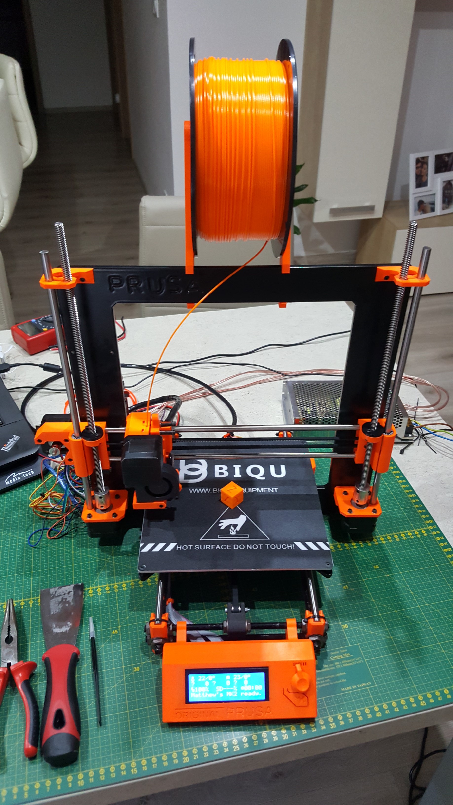 Finally I got my first 3D printer working. It’s based on Prusa MKII with original E3D v6 hotend and a lot of chinese parts. Big thanks to @Thomas_Sanladerer for great youtube tutorial.