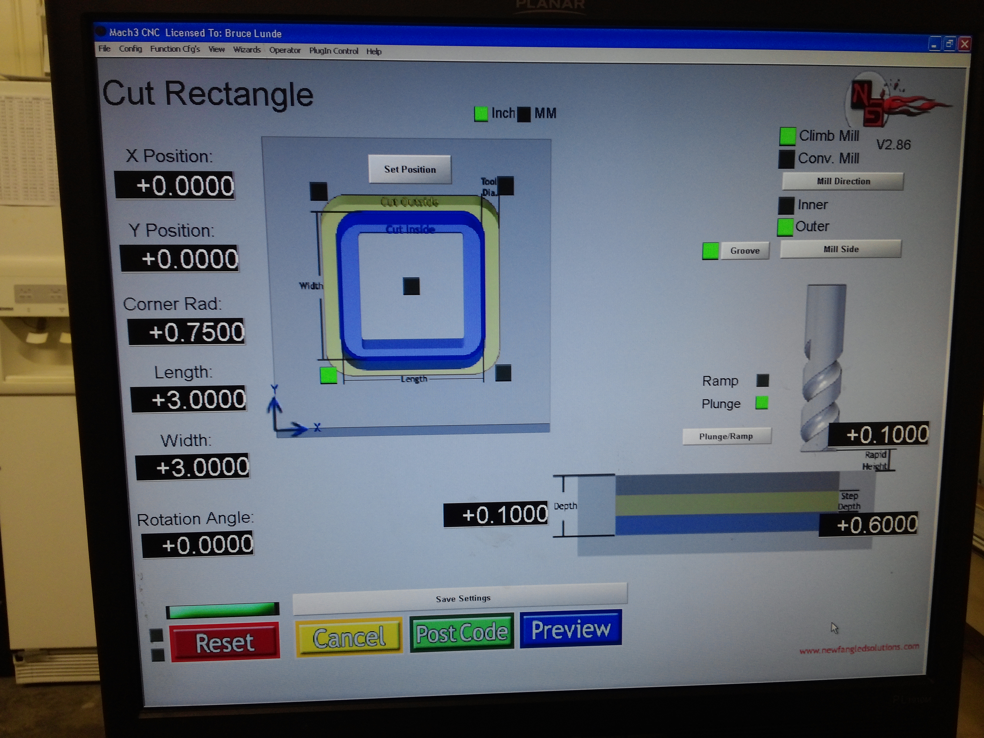 First cut with the new router. Lots of things to do yet, but could not wait to try to cut something. First picture is wizard in Mach3 setting up 3 inch block with curved corners. 2nd picture is of the measurement of the cut, third is a slow movie of the cut. Need to tune up the motors, put on limit switches, and cut a real waste board. Also need to finish up wiring, and build a mount for the laminate router.