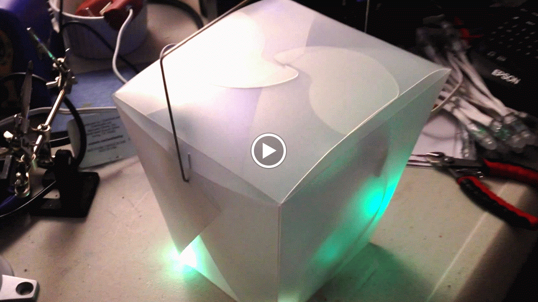 This portable lantern for Boston’s First Night / Figment celebration is made from 25 pixels of WS2811, an Arduino Nano, and a frosted plastic ‘take out food’ container from Michaels Arts and Crafts.