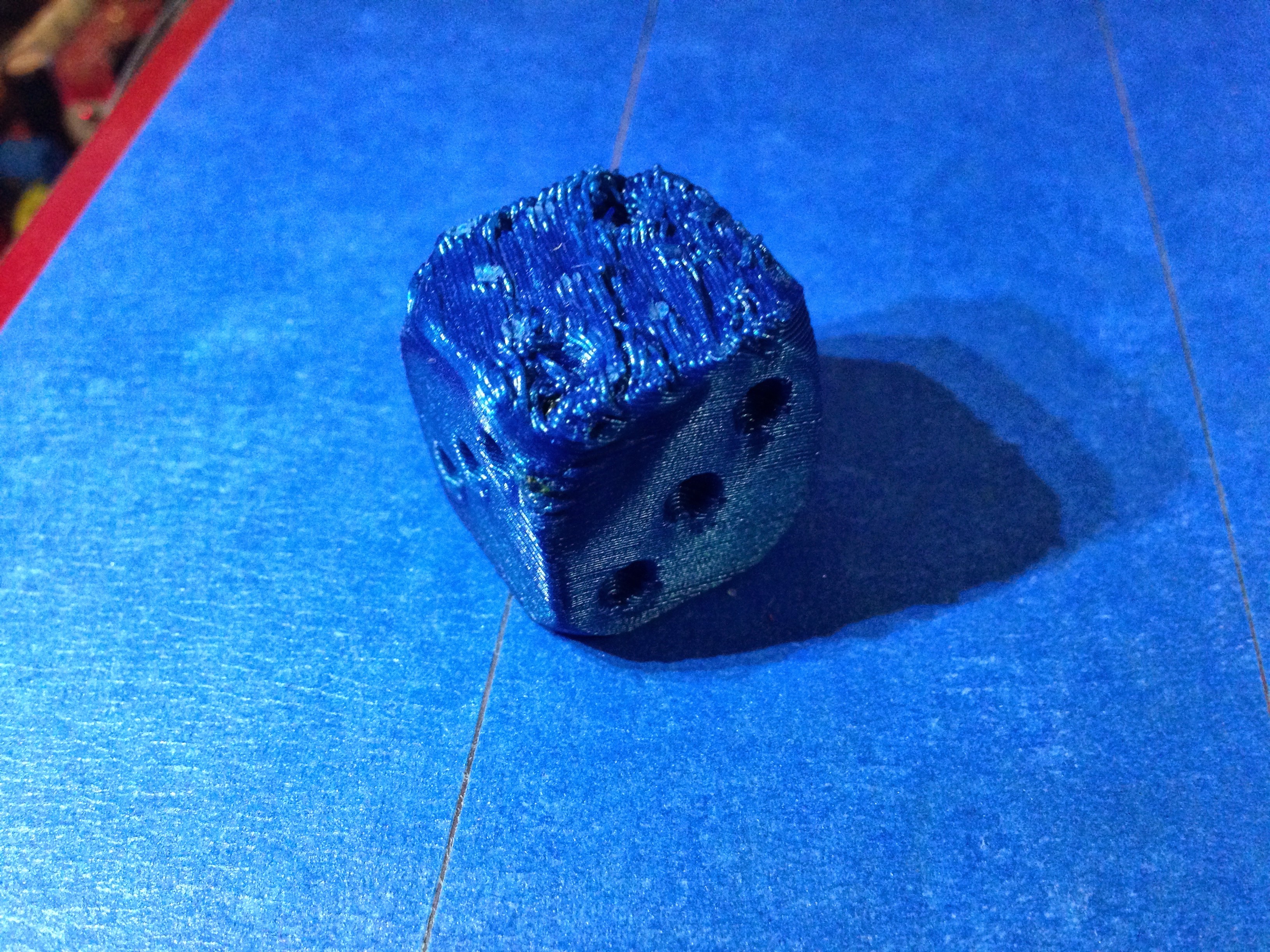 First play with meshmixer support, attempted to print a dice with no “bottom”, I still clearly need a fan, and I think all the way up to 45 degrees would have worked better.