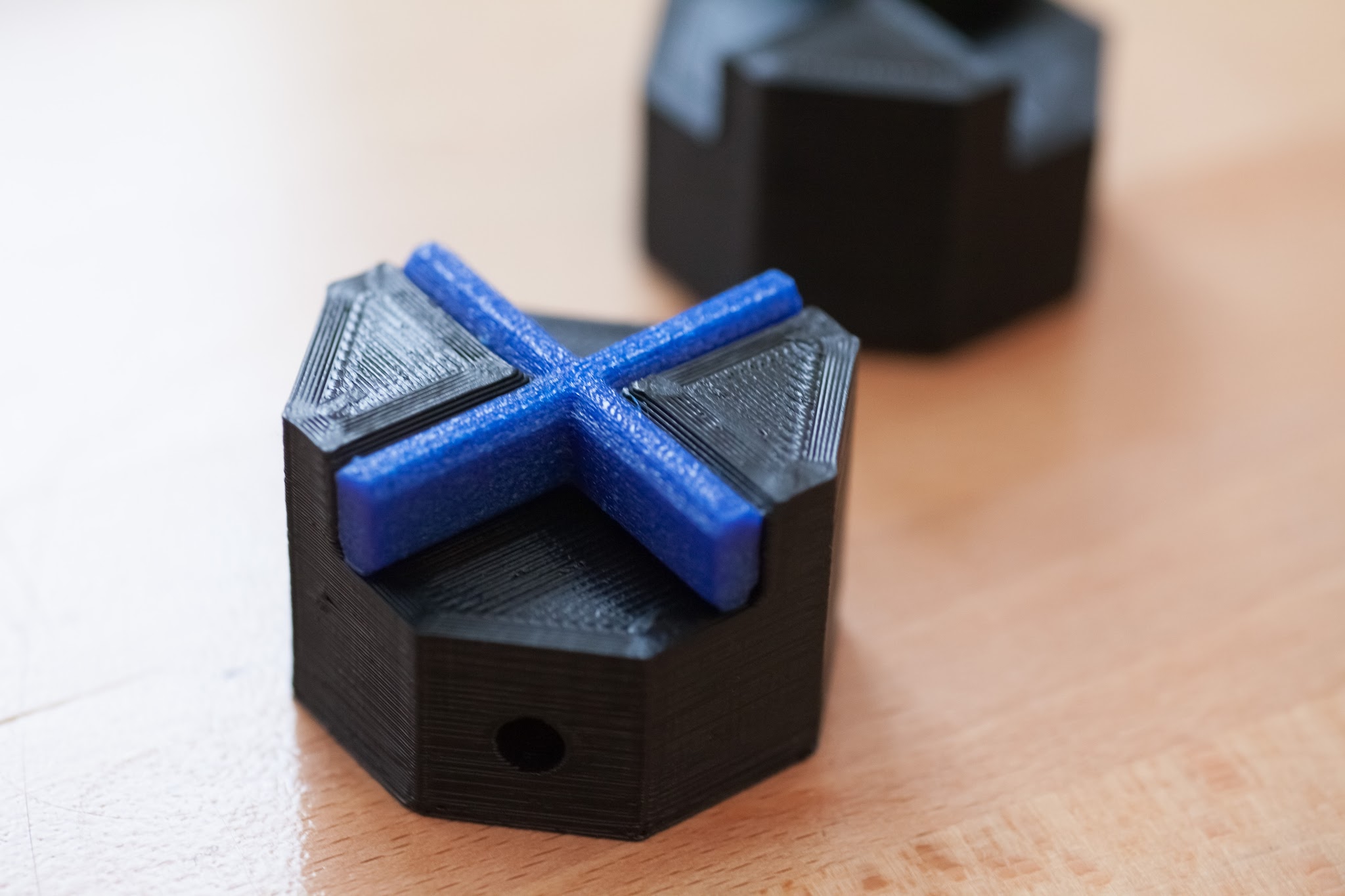 First print with NinjaFlex: a lovejoy-style semi-flexible coupling as a part of my filament extruder’s screw drive. Ninjaflex at 50% infill has just the right elasticity for this job, but at 1.75mm is extremely sensitive to even moderate print speeds. Fenner recommends 30mm/s, but i had to go down to 5mm/s to keep it from buckling in those 2mm between where the extruder’s hobbed bolt ends and the short bowden tube starts that i used to convert my extruder from 3mm to 1.75mm.