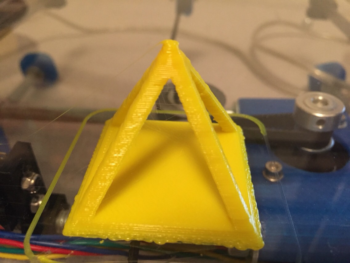 First prints on my Wallace++8m - Just calling him “Mr. Wallace” from now on. Not going to complain first 10mm hollow cube print. Z is a little squished at 9.83xx but first layer was pretty flat and I need to double check z calc and nozzle settings. Bridging was ok on top, sure it could be improved but not sure how to myself. I just used the config off my Prusa I2 as the hardware is similar except the lead screws. Yes, I have taped the bed after trying to get the pyramid off.