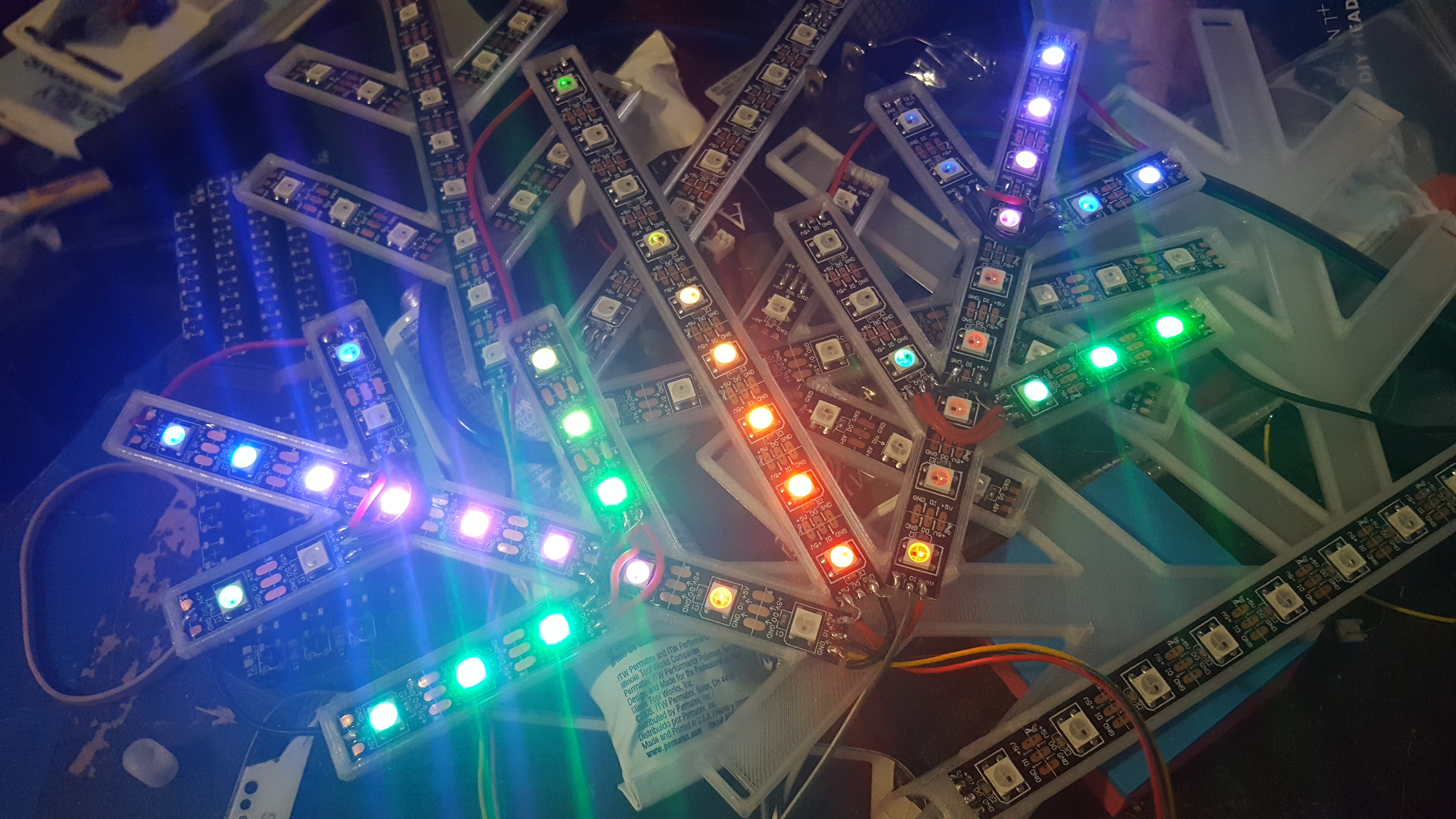 First successful test running multiple data outputs as 1 strip. Now i meed to wire up the other half of this snowflake. Then define all 4 pins as a matrix and setup OTA programming and throw this sucker outside for christmas