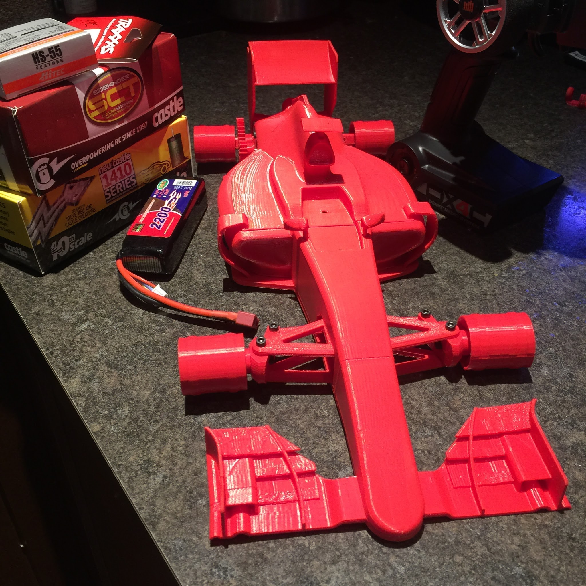 First test build of Daniel Noree’s excellently designed F1 car printed in ABS. Build notes: using RTL fasteners hardware I found some of the 3mm nuts didn’t go in so I substituted 2.5mm hardware. The rims and back spoiler required raft+bridging support, and the big tall body pieces required extra wide rafts to stay stuck to the build plate. The only servo that’s could source locally in hobby shops was a hotel HS-55, pretty anemic for a steering servo, I’ll have to rework that do something better, the HS-225MG is a bit too big to fit into the nose but something like a HS-5085MG might fit in with a slightly reworked servo holder. Two pairs of widely available 2mm bearings (Traxxas Part, 7020) can be used for the wheels. Everything fits into the very cleverly secured by springy scale aero parts main compartment of the monocoque very tidily.