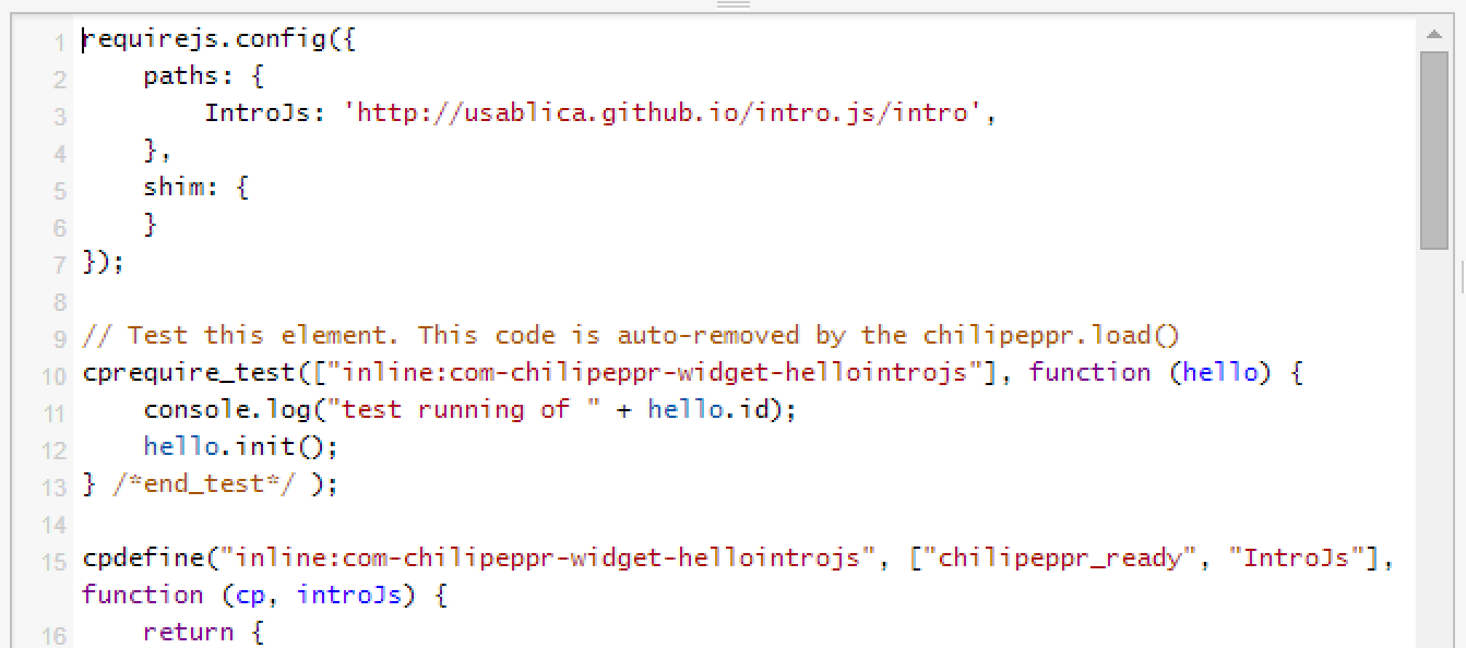 For those of you wanting to pull in an external Javascript file to your custom widgets, here’s a new Hello World IntroJs example. The key is the requirejs.config() at the top and then pulling in the dependency in the cpdefine(). http://jsfiddle.net/chilipeppr/fLtfxtzn/