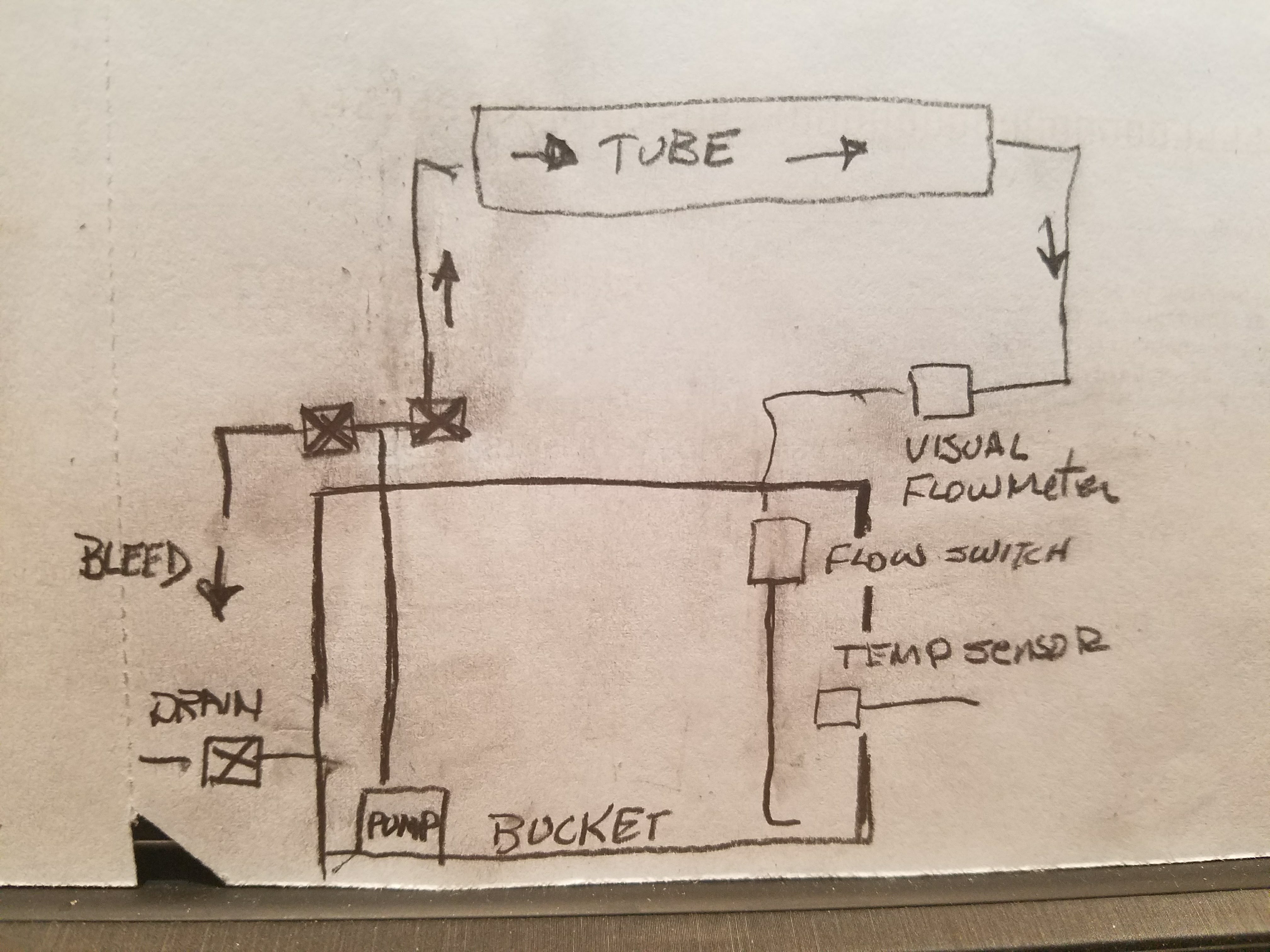 Then again as I look at this drawing, maybe the simple approach is to have a drain valve in the bucket just above the pumps water level so that the tank can be drained yet the cooling loop is never broken. The disadvantage is that not all the water is replaced with a exchange but I think that small amount would not be a problem? I like this idea because it allows the tank to be drained without pulling it out from below the machine. It would also facilitate having a larger reservoir for more cooling capacity.