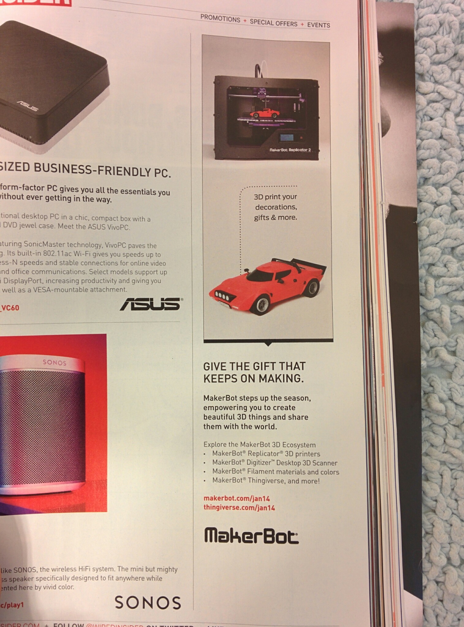 Found this Makerbot ad in January’s issue of Wired. I find this incredibly misleading to post a picture of a 4 color print in the bed of a single color printer, with no trace of any support material to boot. They may as well have put a cat on the bed and say “3D print your pet.” For a company targeting consumers, not makers, this is unethical in my opinion.