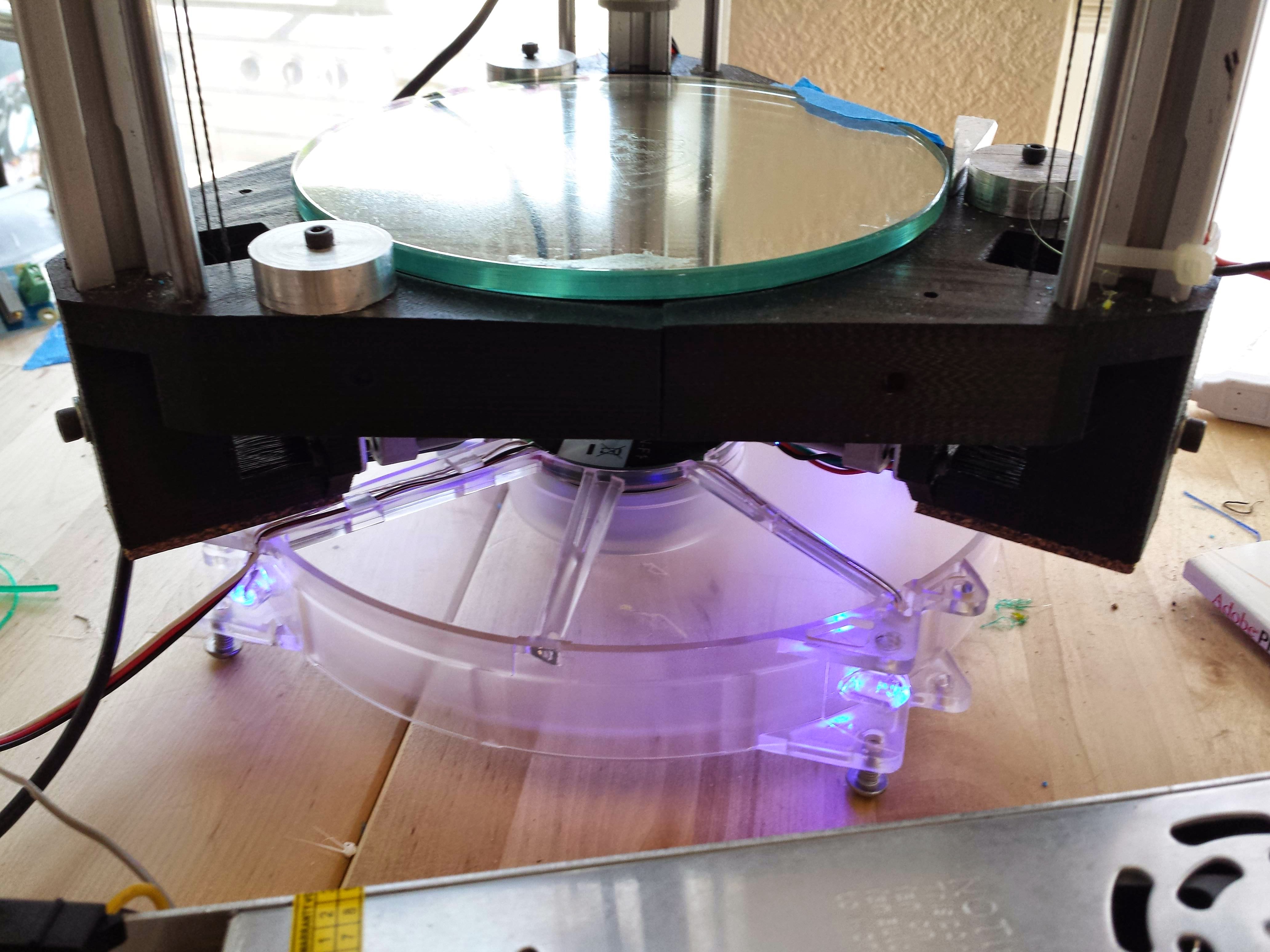 From the “If it works, it isn’t stupid” category…I picked up a 200 mm fan on a whim at my lsst trip to Microcenter. I suspect my motors are getting hot, causing the spools to expand and slip, so I threw four screws on the bottom of the fan to lift it up off the table, and set the printer on top of it. I’m a little worried about the 90 degree holes on the fan and the 120 degree design of the printer, but that’s what experimentation is for…and heck, it was a $10 experiment!