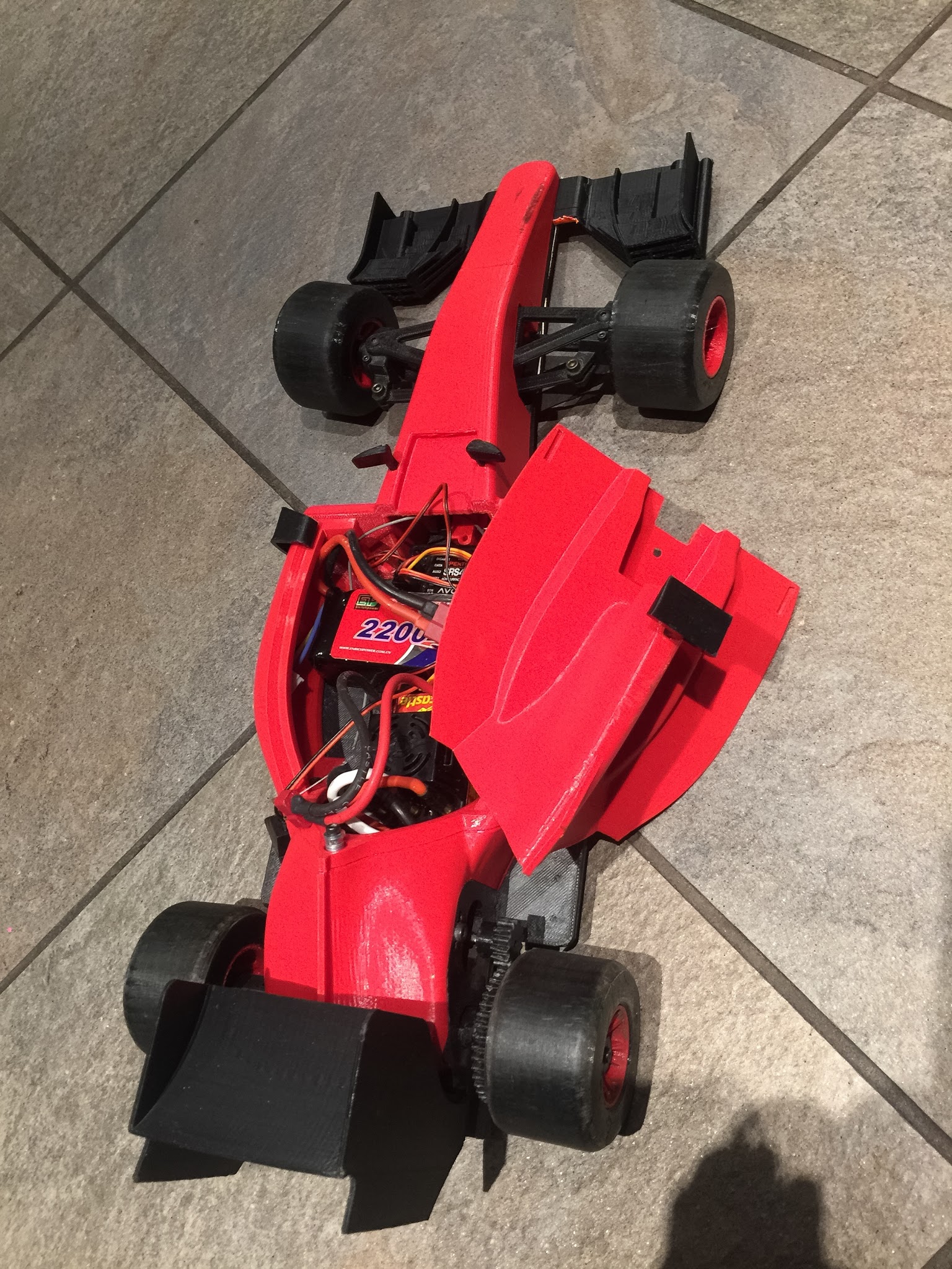 The Castle Sidewinder SCT motor/controller combo I’m using just barely fits in the car and is way too much power especially with the 50c 3s 2200mAh batteries plentiful current, haven’t ever really gotten above 50% throttle under any reasonable control of the car, and I had a hard time not shredding gears and axles at first. Eventually went with 100% infill with the drivetrain (gears, axle) too, and that’s strong enough now (in ABS). Super over powered is a blast of fun, but requires much more careful throttle control. Recommended.