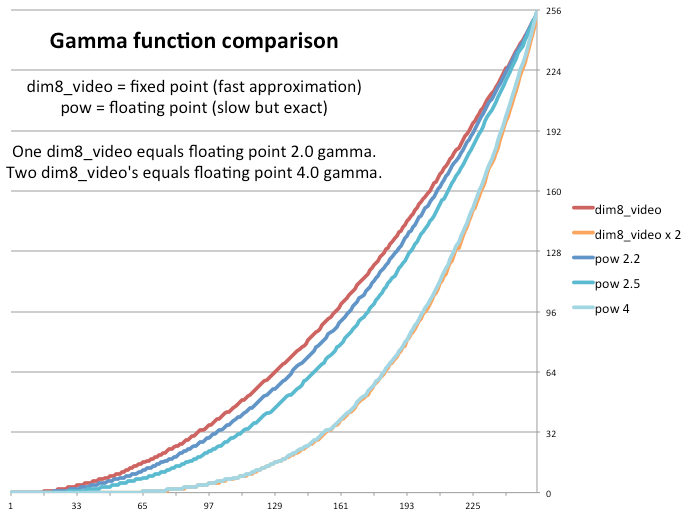 I had often wondered ‘how good’ an approximation dim8_video is to an exponential floating point gamma correction of 2.2, and now we know: it’s a reasonably good approximation (gamma=2.0) given the big speed advantage. Applying dim8_video twice gives a gamma of 4.0.