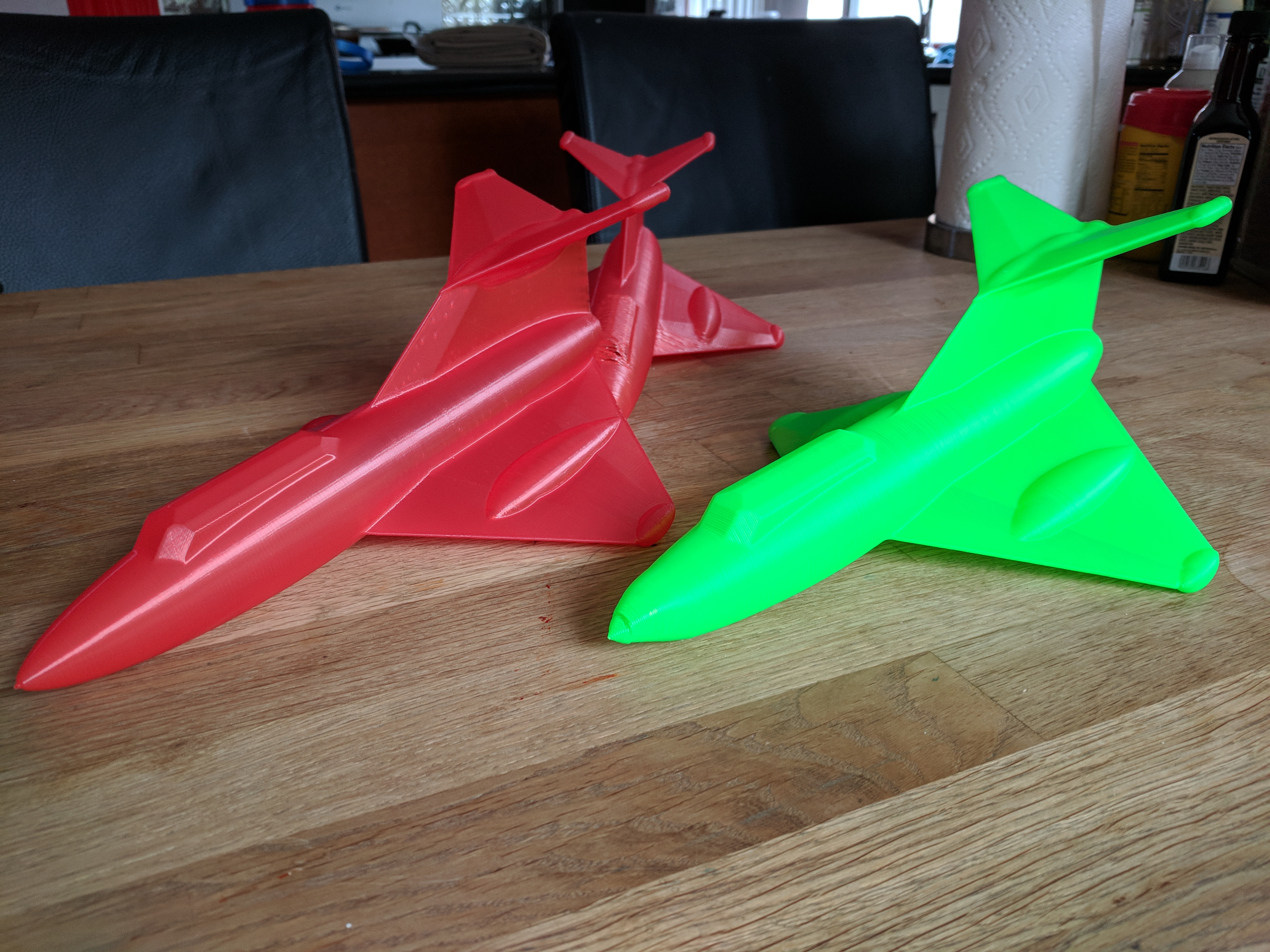 Green is 0.6mm(?) x 1.2mm(?) and a different source (red is Maker Geeks and green is 3D Solutech), so the filament might be a cause (though they seem similar in printing). Had some prints at 0.6mm x 0.8mm and 30mm/s, but they left the state with my grandson.