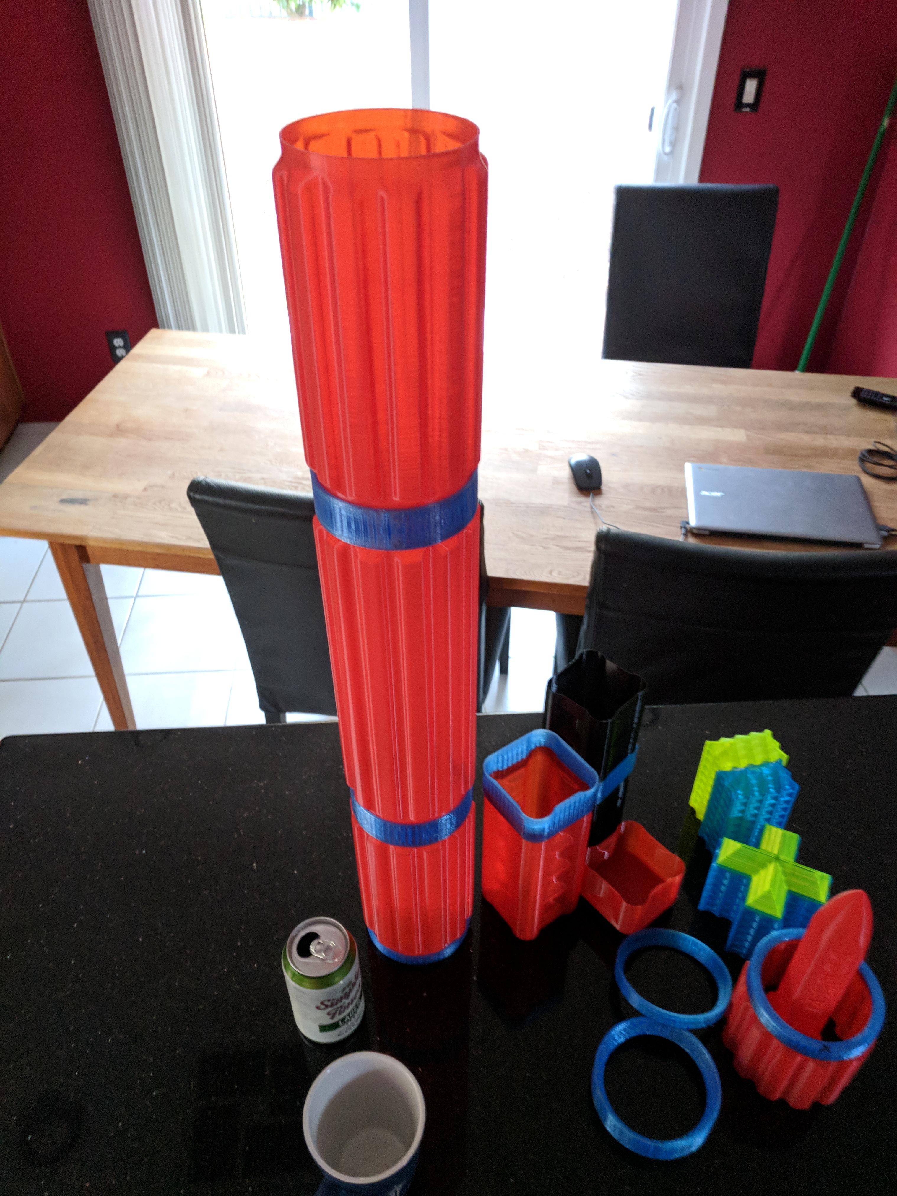 The red columns are printed with 0.5mm layers and 0.8mm walls (using a 0.8mm nozzle). As simple cylinders, the thin walls would be prone to crumpling. Was not sure if the 300mm column (center) would be sufficiently rigid. (It is.)
