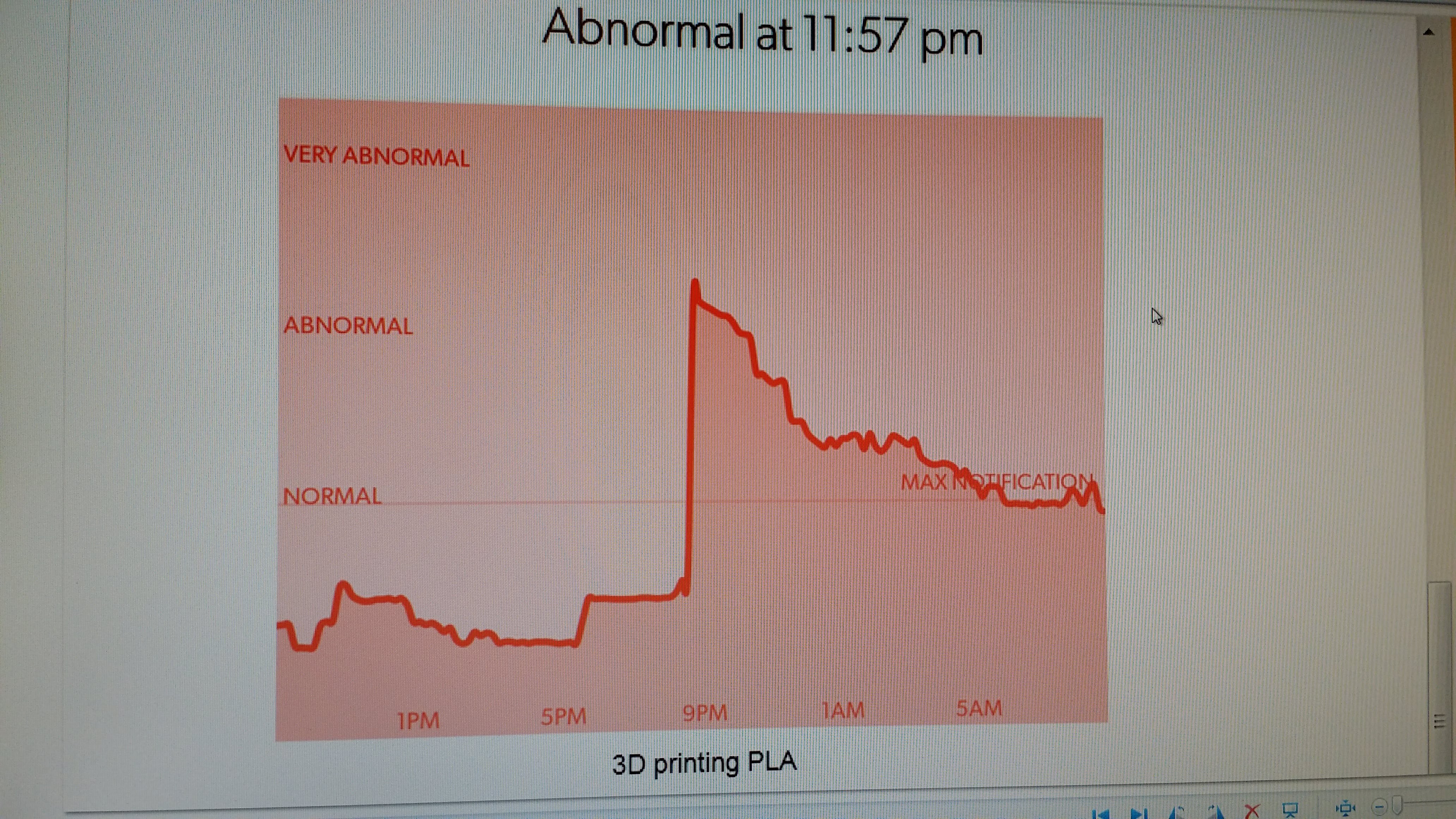 Here is the graph of my living room air when I started 3D printing as measured by my “Canary” air quality sensor. I have no idea how harmful it is but the sensor sure picked something up, but cooking never set it off.