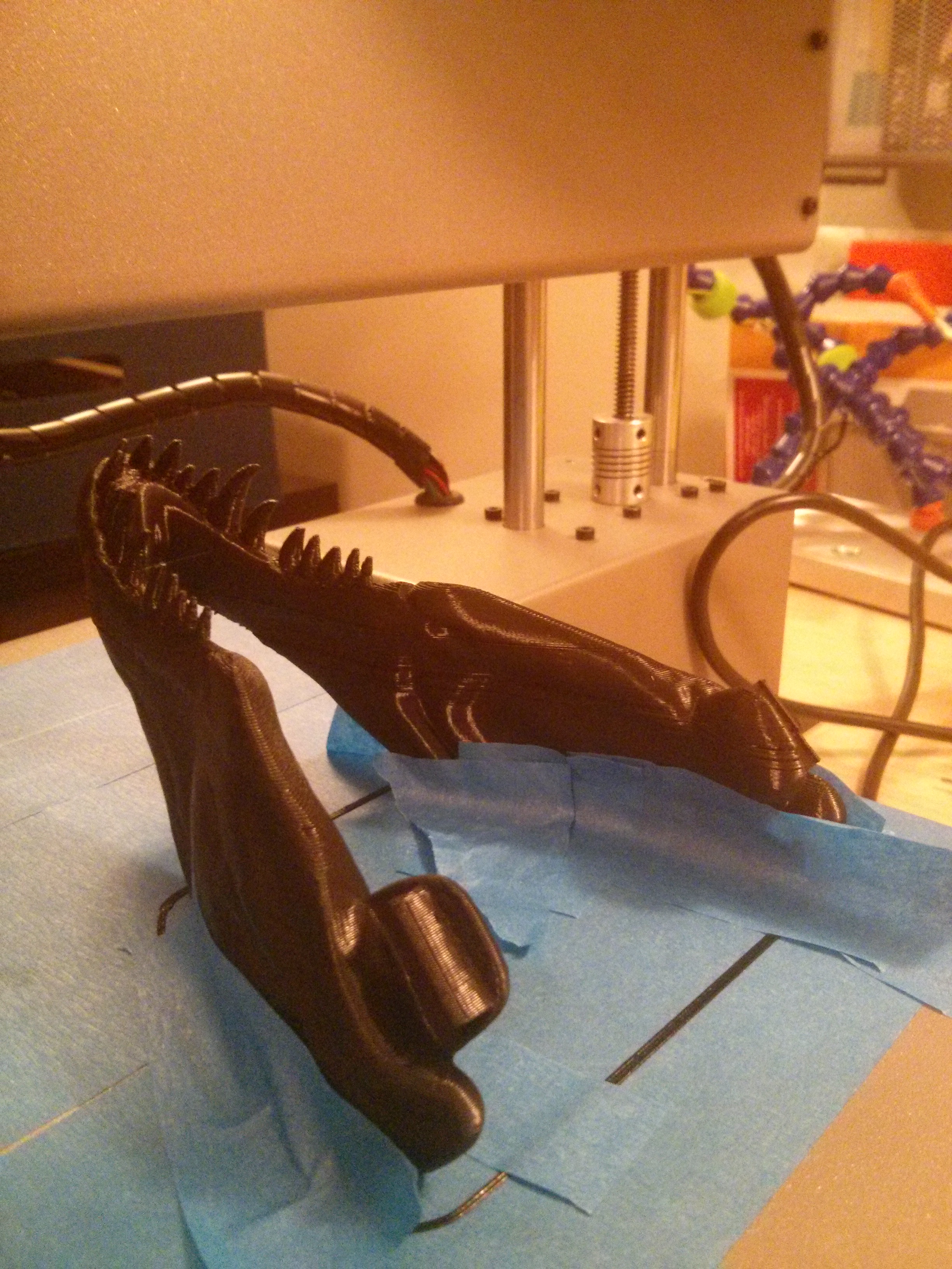 Got frustrated with the printer knocking over the parts of the T-rex jaw before they were joined at the mouth, so I taped them to the bed in mid-print. Is this cheating?