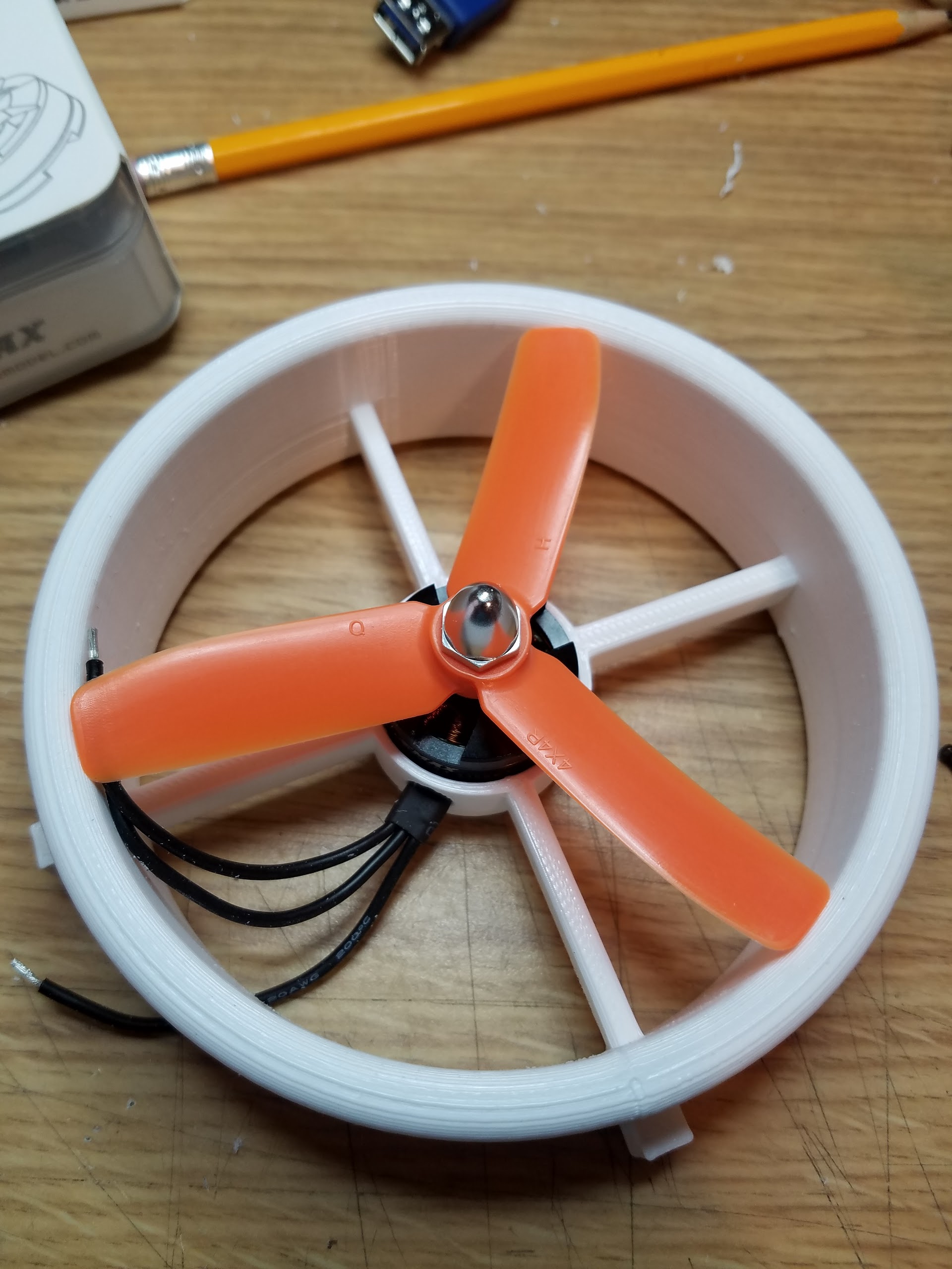 One thing you might want to tweak is that the prop seems a bit high up to gain any efficiency and protection from the housing. If you drop it slightly lower you’ll get better thrust output and probably avoid the issue of prop damage from tipping.