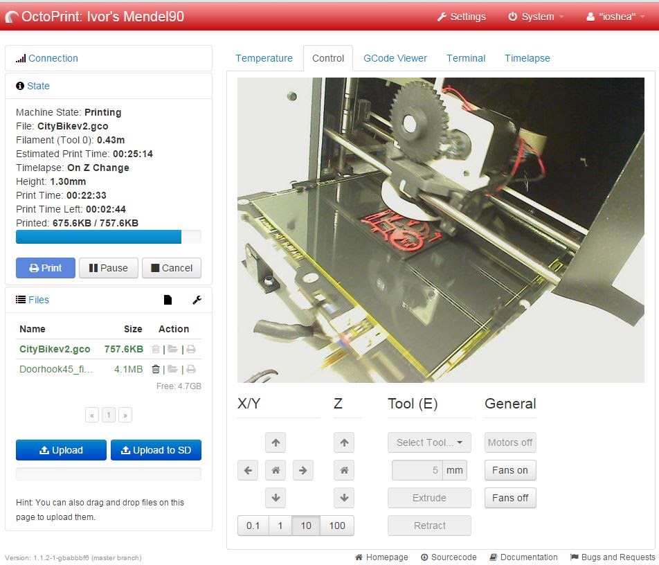 Got OctoPrint (OctoPi) setup and working with my Mendel90. It’s on the wifi, camera attached so saves me nipping in and out to the garage ( “workshop”