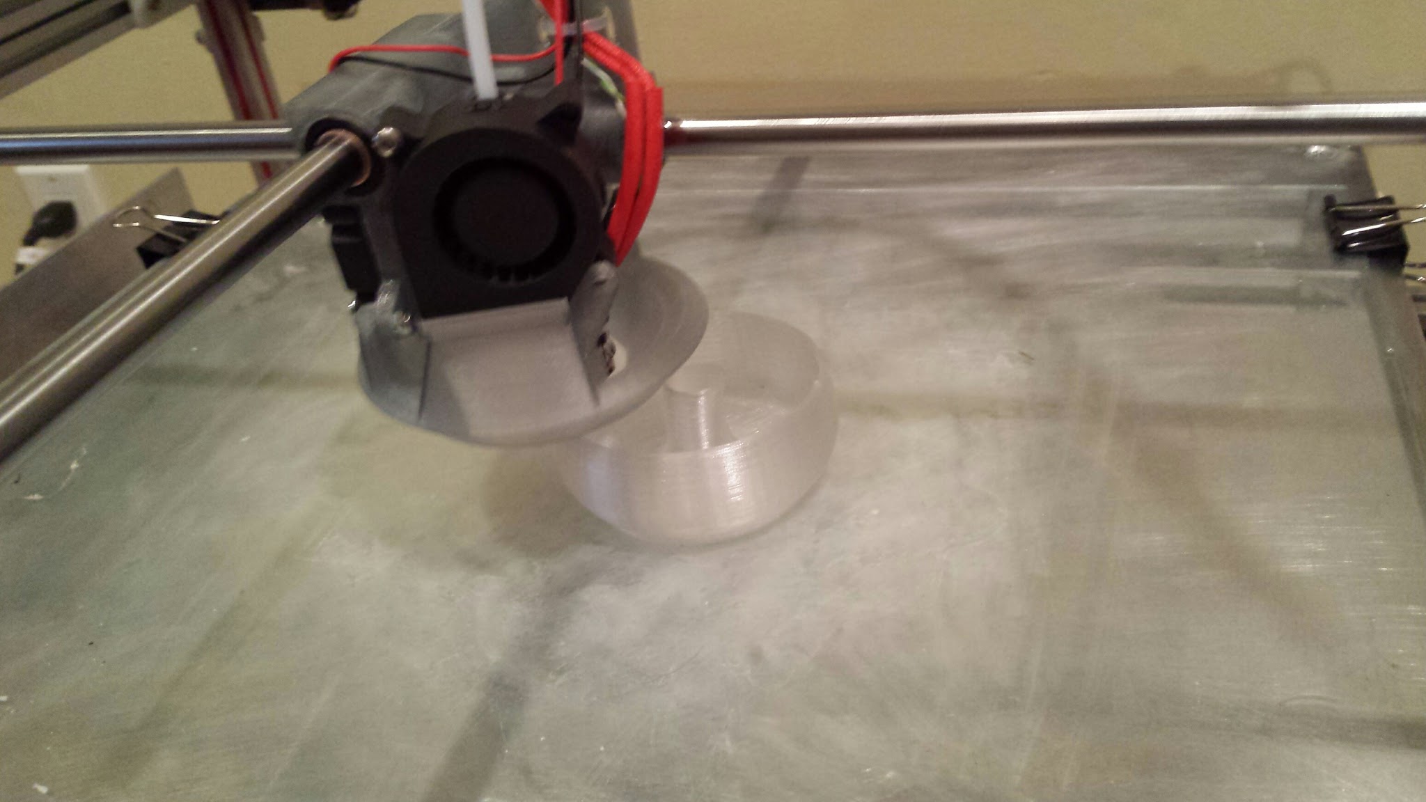 Got some LED Lights hooked up to my Azteeg X3 board on pin 11 and added button switches on Pronterface with the m42 p11 s255 for ‘on’ and m42 p11 s0 for ‘off’. Also got my Eustathios V4 Carriage mounted, Not an easy swap, practically had to disassemble the entire gantry. Other than that it is back to printing. The only negative thing with the new carriage is that I cannot clear unexpected plastic ooze from the hot end while it begins to print because the fan housing is very much in the way.