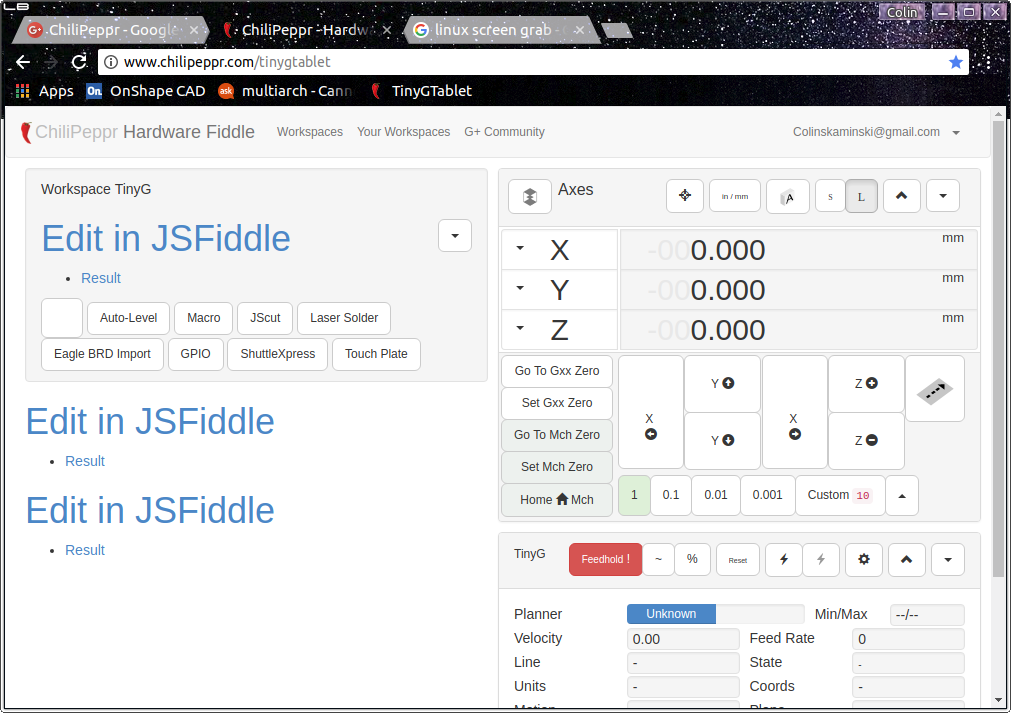 Greetings, I have long had a problem getting chilipeppr/tinyg to work for me. I think my systems are simply too slow. A good compromise has been to run chilipeppr/tinygtablet. I am running Ubuntu 4.10.0-35-generic on an Intel i7 CPU 920 @ 2.67GHz machine with 24mB ram. I have OpenGL version 4.5.0 NVIDIA 375.66. When I run Chilipeppr/tinyg the browser hangs for a good 30 seconds or so and then commands function very slowly.