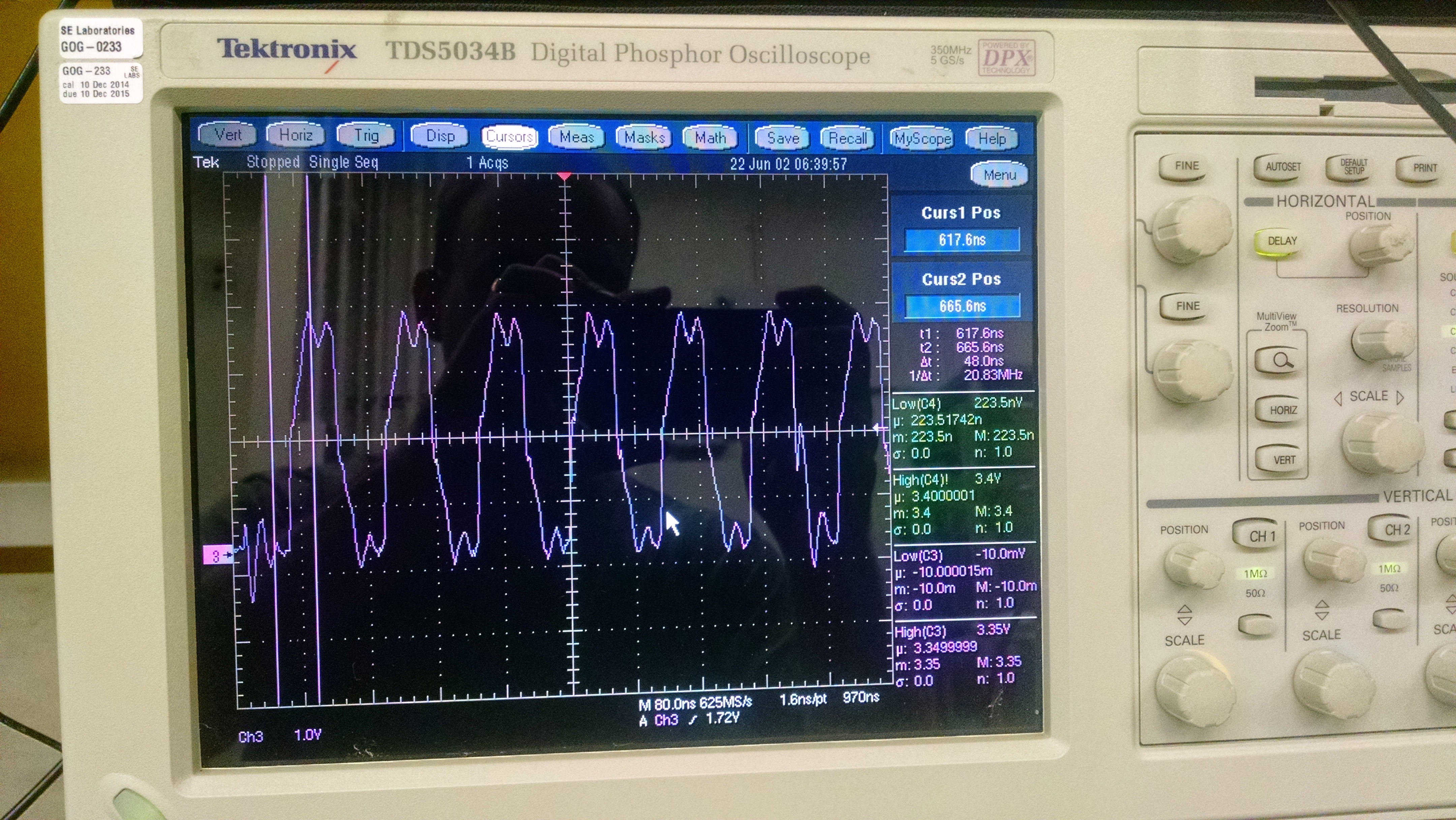 b) right about where the first flickering LED is, the clock appears good (visual inspection only), but farther down, it is degraded (random/intermittent voltage spikes).