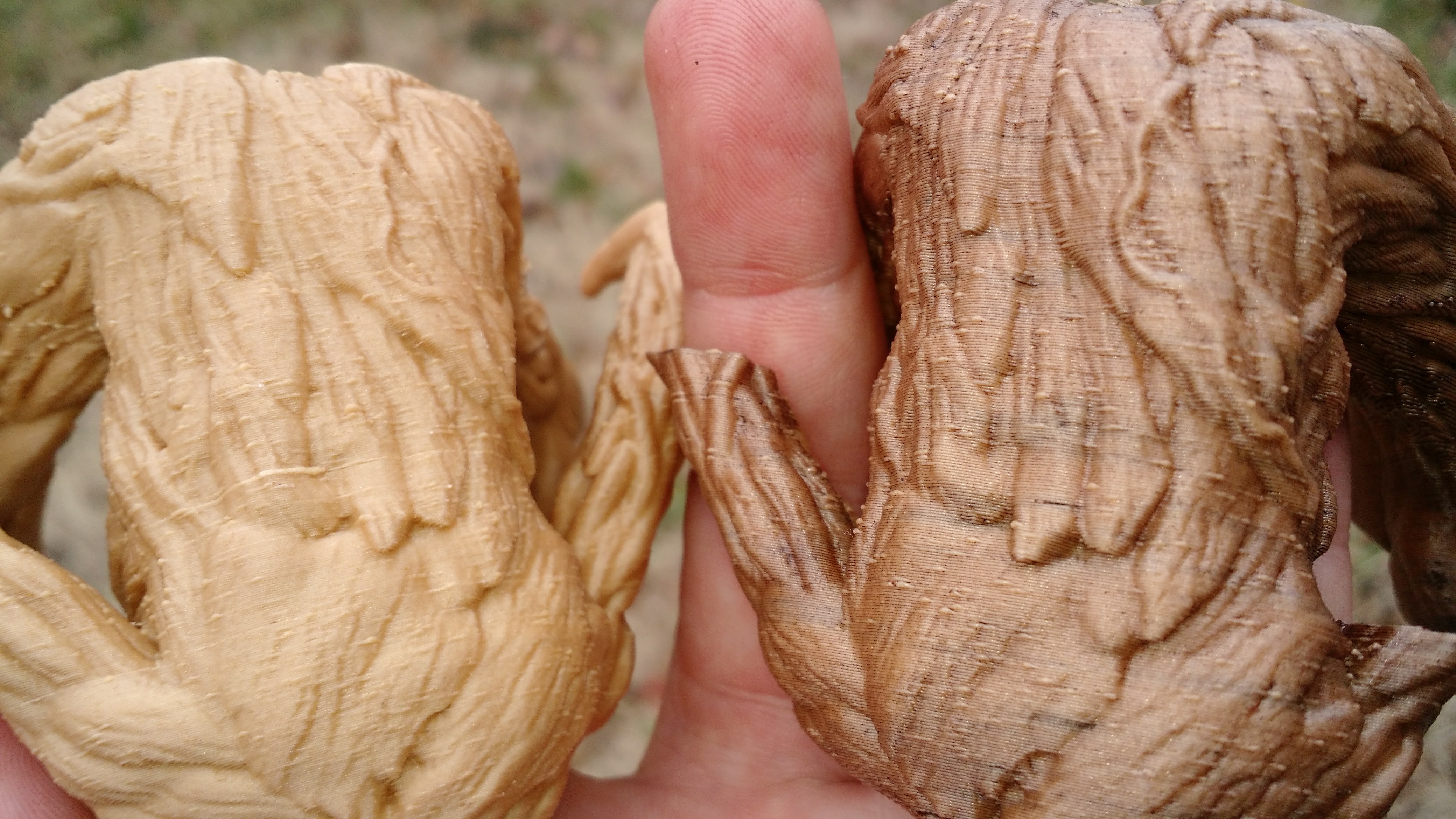 Had a few failed test prints of the little Groot print that I could test out some finishing on… The one on the left is how the material looks after printing… The one on the right is with mahogany wood stain applied and excess wiped off… Looks like wood fill material is lightly stainable