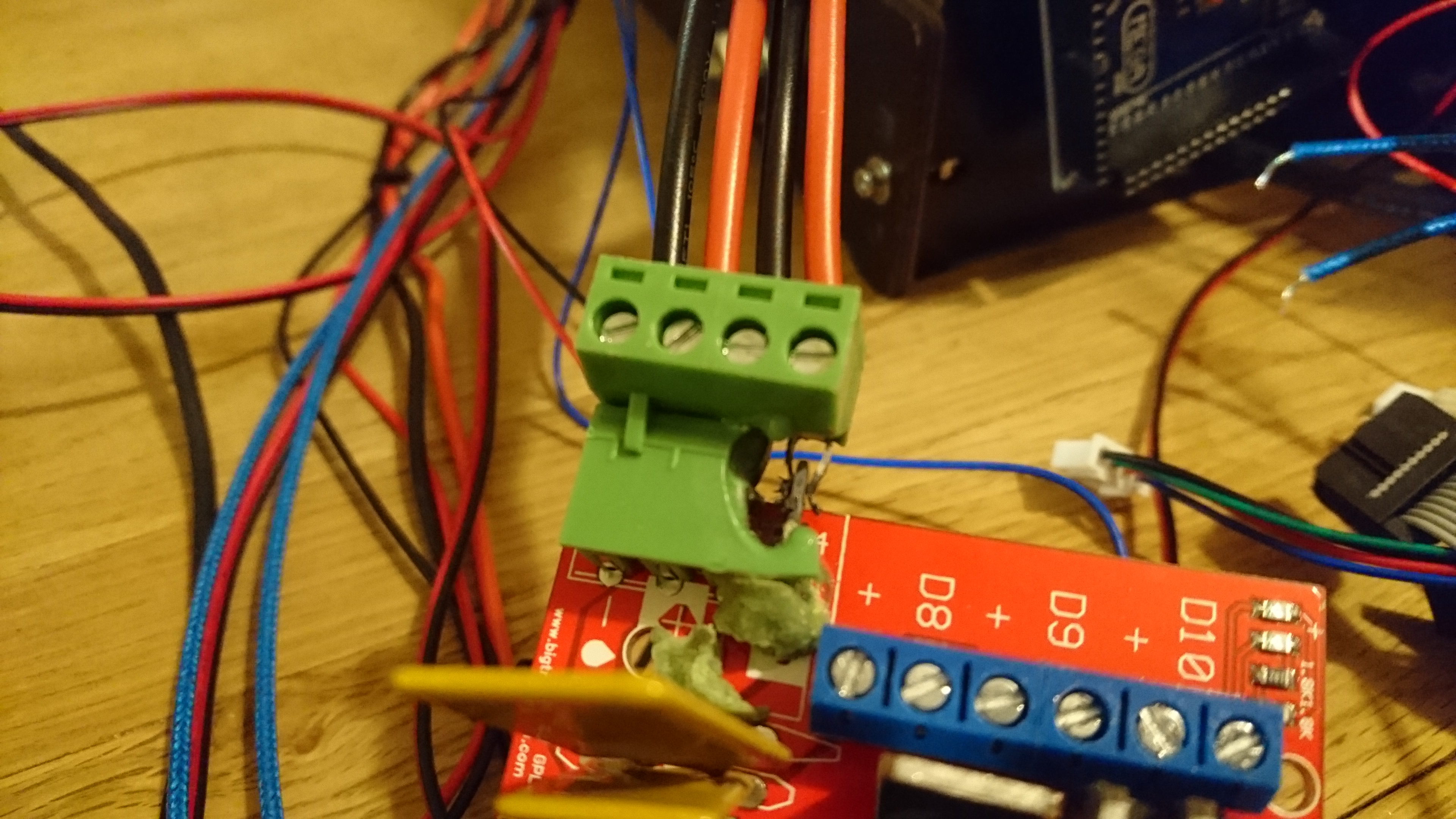 Had an interesting evening yesterday. Luckily I was sat next to the printer waiting for it to heat up before starting the print. So as soon as I saw the smoke I could cut the power. Being new to the 3D printing world I wasn’t aware of the problem with these green connectors being underrated, so it came as quite a surprise when it started smoking