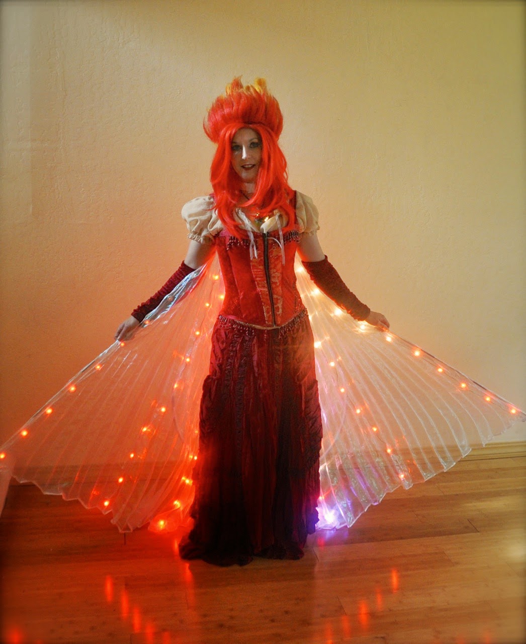 Halloween costume #2: Phoenix! Isis wings running @Mark_Kriegsman 's unstoppable Fire code. (I had a gig at a silicon valley tech company Halloween party, and they were all delighted to geek out about the wings with me, so that went well)