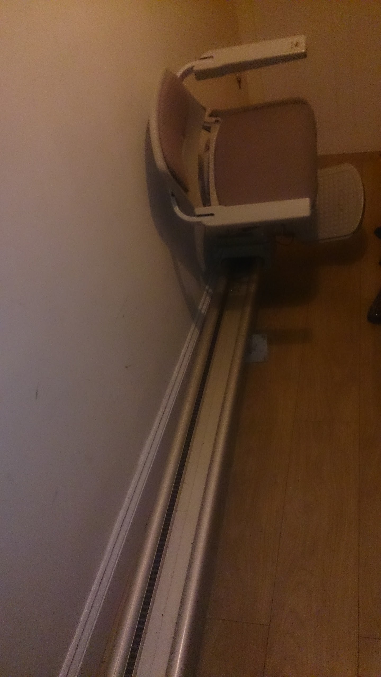 Has anyone ever used a stairlift to make a linear track? Picked this one up on ebay for £50… Great solid track 4 meters long and a 24v 250w geared motor driving a rack and pinion. The stairlift is capable of lifting a 175kg weigh up an incline so I don’t think torque is a problem