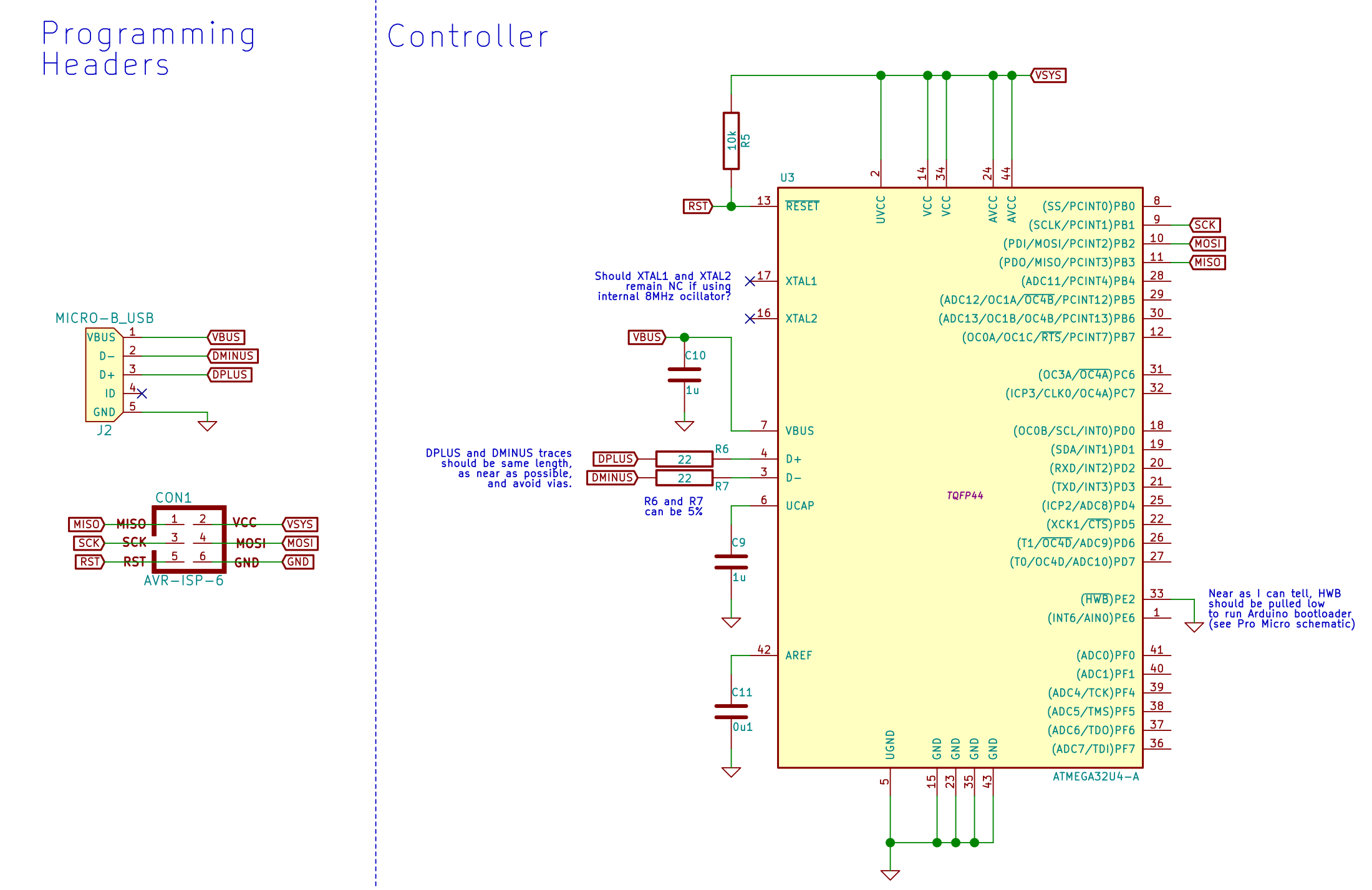 My next project is to be a hackable, wearable light toy, so I want to provide USB programing by way of using an ATMega32U4 microcontroller and Arduino’s “Caterina” bootloader (i.e. identifying as a Leonardo). I’m looking to minimise the BOM size, so I’ve opted to omit the 16MHz oscillator crystal (and associated capacitors) and instead use the ATMega’s onboard 8MHz oscillator.