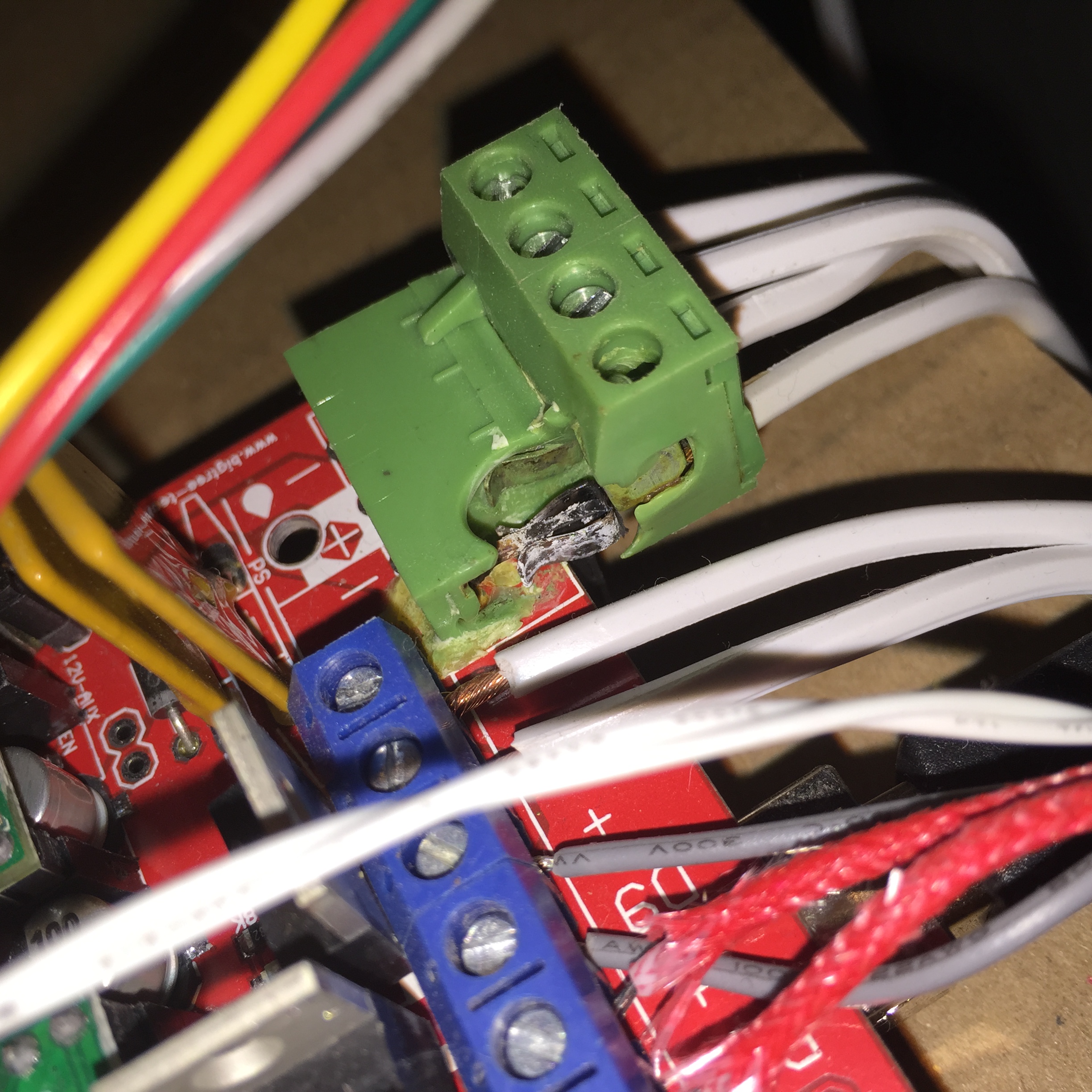 All that current and too much contact resistance by the looks of it. I just bought a cheap RAMPS and it has the exact same look to yours (except it ain’t toasty yet).